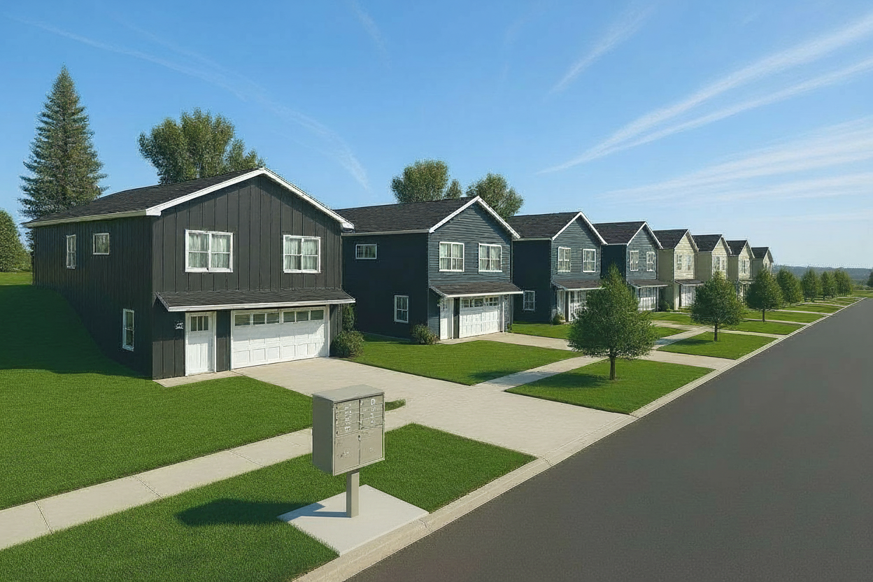 render a serene suburban neighborhood with modern houses each with dark exteriors in shades of charcoal gray navy blue and olive green incorporate contrasting white trim around the windows and doors highlight neatly manicured lawns in a fresh vibrant green with carefully pruned hedges and small flowering plants in soft pink and purple arrange the houses along a smooth asphalt road under a clear bright blue sky with fluffy white clouds create a peaceful inviting atmosphere with soft natural lighting and add lush tall trees in the background to enhance the tranquil suburban setting