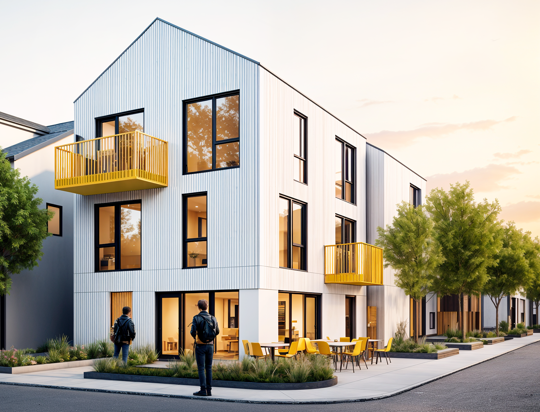 transform the modern structure into a traditional arts and crafts style residence replace flat surfaces with vertical board and batten siding with red tumbled brick near the base of the structure features low pitched gable roofs with wide overhanging eaves exposed decorative rafter tails and tapered square columns supporting a deep front porch bottom level is commercial cafe with outdoor seating with a sidewalk in the front and grass park on all sides mirror the image windows should be vertically oriented multi pane true vertical oriented divided lite with thick wood trim incorporate earthy textures hammered copper hardware metal roofing and tumbled brick accents lighting should be warm featuring mission style amber glass lanterns high detail organic textures cozy and artisanal atmosphere