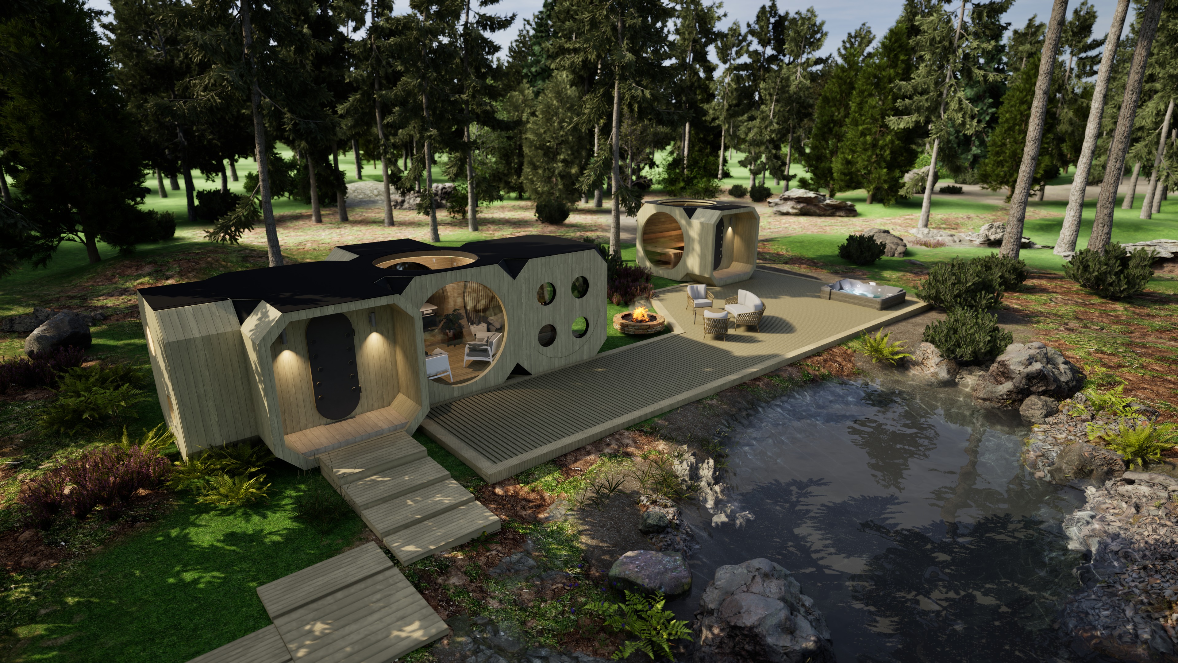 create a photorealistic render of the same architectural scene keeping the original camera angle building placement and overall composition unchanged adapt the surrounding nature to resemble a realistic estonian environment use a black roof add a jacuzzi on the terrace adjust the tree placement to look more natural and suitable for northern europe make the water more realistic in texture and reflection along the shoreline add natural coastal reeds and grasses typical of estonia matte black roof