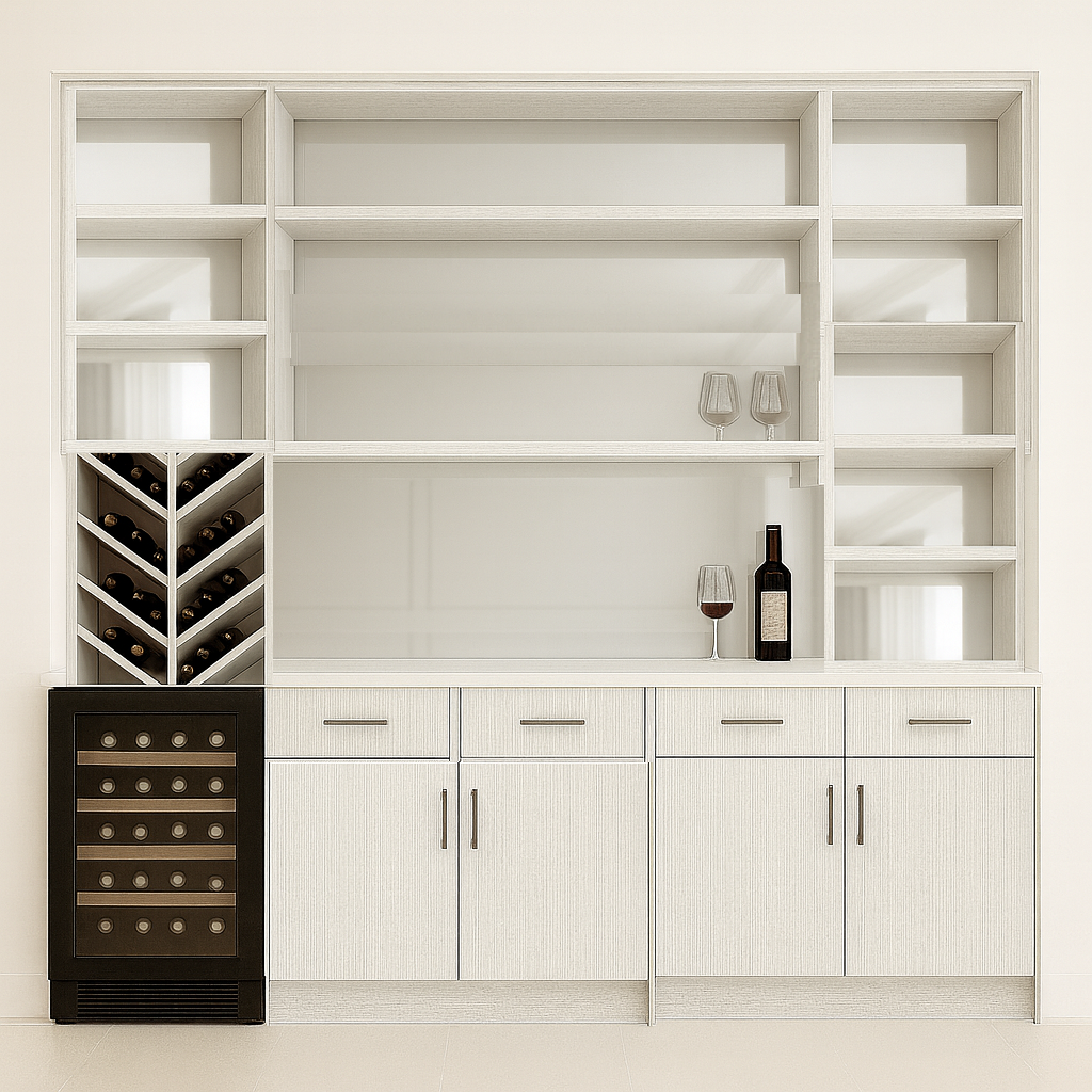 create a rendering of a den office with elegance and sophistication make it warm and inviting with white oak cabinetry