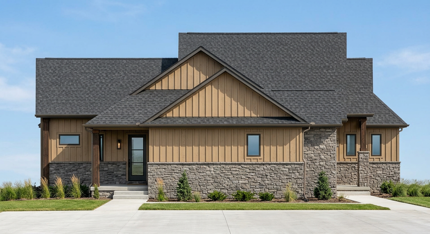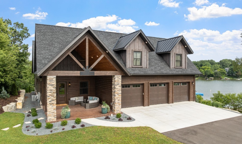 tennessee mountain home near water dark barnwood shingles add fireplace under porch adjust furniture to face fire place metal black roof standing seam evening turn lights on concrete floor at porch new outdoor furniture to face fire place