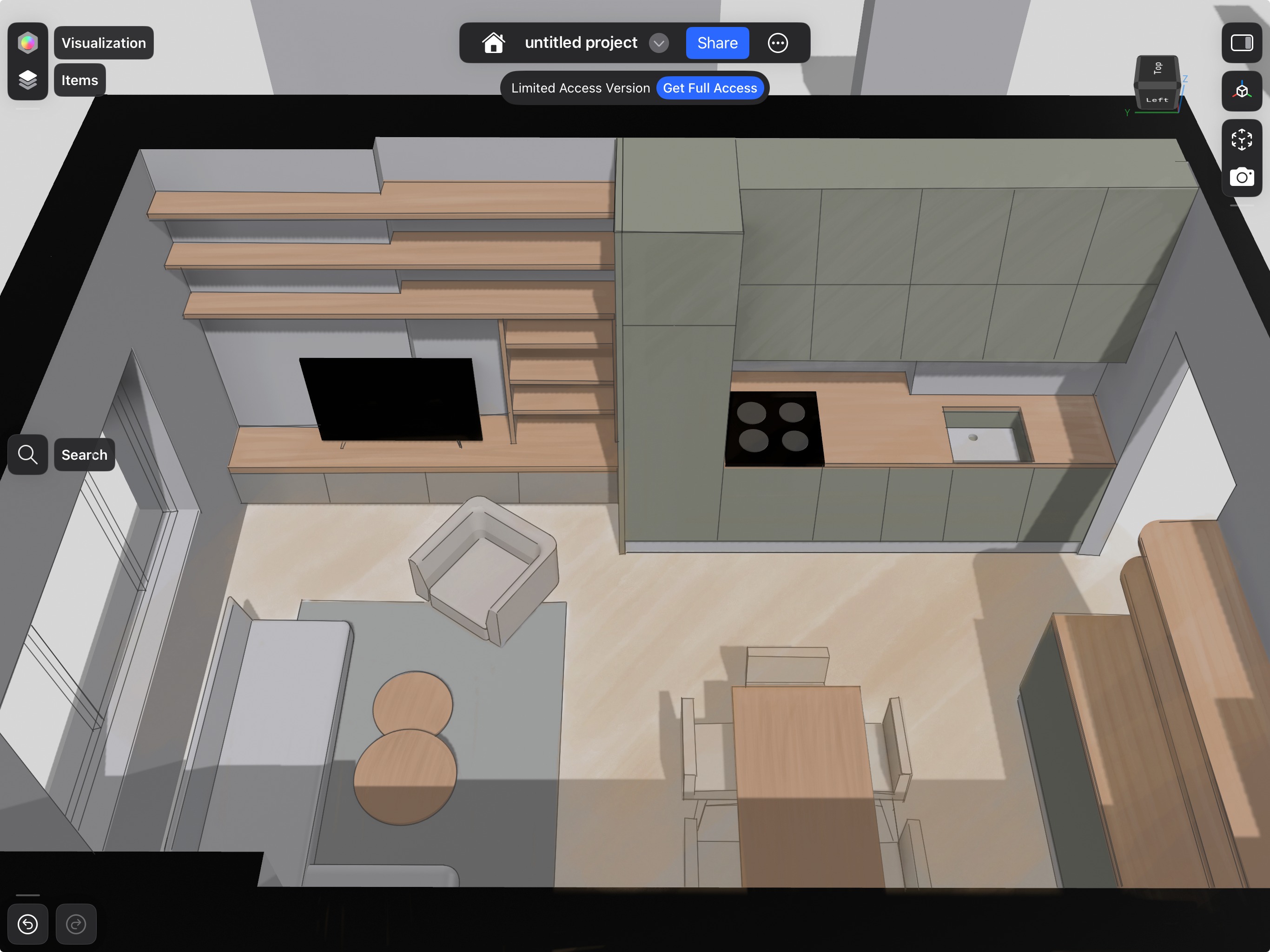 use the provided apartment photo as the base for the scene keep the original architecture of the space large window white walls herringbone oak parquet floor high ceiling and double glass doors the floor should be natural oak herringbone parquet similar to the reference photo warm tone matte finish clearly visible wood grain design a modern cozy living space a round wooden dining table with four chairs around it placed in the dining area a dark grey fabric sofa with a visible textile texture in front of the sofa place two round coffee tables made of natural oak wood with a soft minimalist design a light grey area rug under the sofa and coffee tables a light grey designer armchair with a soft sculptural shape kitchen design modern sage green kitchen cabinets soft matte finish wooden countertop in warm oak tone minimalist integrated handles tv wall minimal tv unit with floating shelves made of natural oak wood clean modern composition atmosphere and styling scandinavian modern european interior design warm natural daylight coming from the window soft realistic shadows subtle interior decoration few books small plant ceramic decor highly realistic materials natural textures interior