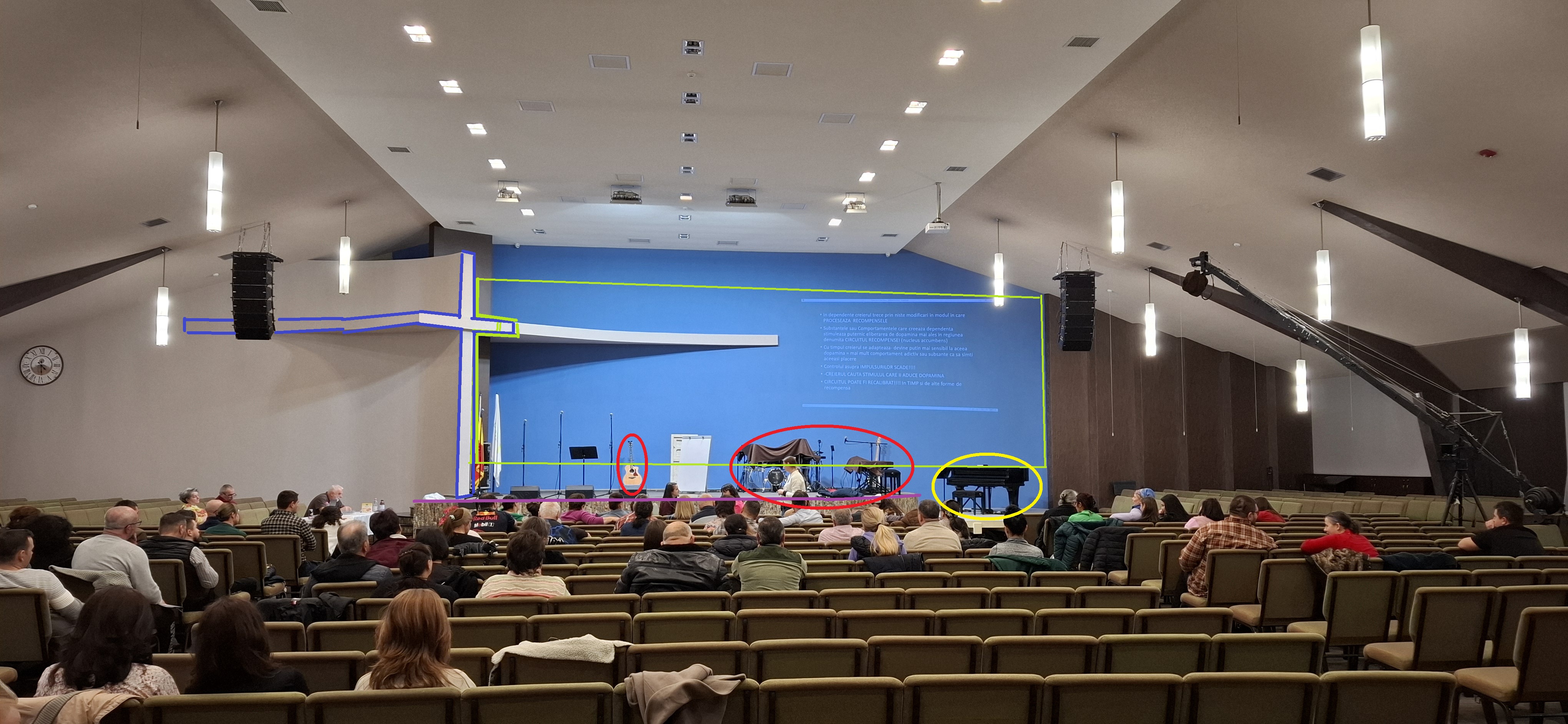 photorealistic architectural rendering of an existing pentecostal church interior stage viewed from the main nave camera position fixed centered symmetrical composition preserve the entire architecture exactly as in the original reference image including ceiling geometry hall volume stage platform pulpit position lighting fixtures acoustic elements and all equipment positions unless explicitly modified below intervention must affect only the blue background wall existing conditions to preserve blue background wall is the intervention surface cross on the left formed by a vertical curved wall element descending from ceiling to stage floor must remain fully visible and unchanged in geometry horizontal gypsum board element representing the cross arm must be shortened significantly so that it becomes minimal ending near the vertical curved cross element without extending toward the center no changes to ceiling stage structure hall geometry or architectural proportions camera angle and perspective must remain identical new architectural intervention on the blue wall integrate a very large led screen occupying almost the entire width and height of the blue wall led screen must extend close to left and right edges and from near stage floor to near ceiling but must not overlap the vertical curved cross element led screen must be bordered at the bottom and top by horizontal black decorative panels placed in the exact same vertical plane as the led screen these black panels must create a clean architectural frame with a visible separation line between led and decorative panels decorative panels must be matte black minimalist elegant modern church design language cross integration the vertical curved cross element on the left must visually flow continuously across the entire wall height remaining clearly visible cross must remain architecturally dominant and unobstructed stage functional reconfiguration main stage must contain only the pulpit place a realistic human figure representing preacher vladimir pustan standing at the pulpit in natural preaching posture all musical instruments must be relocated to a secondary lower platform on the right side in the exact position where the black piano currently exists on this lower right platform place three microphone stands for vocalists atmosphere and realism church hall must be full of people seated and standing realistic congregation led screen must display authentic pentecostal worship imagery singers worshipping raised hands soft stage lighting lighting must be warm cinematic realistic church lighting materials must be physically accurate matte finishes subtle reflections correct shadows style modern minimalist church architecture high realism clean geometry balanced composition professional architectural visualization no exaggerated or futuristic elements