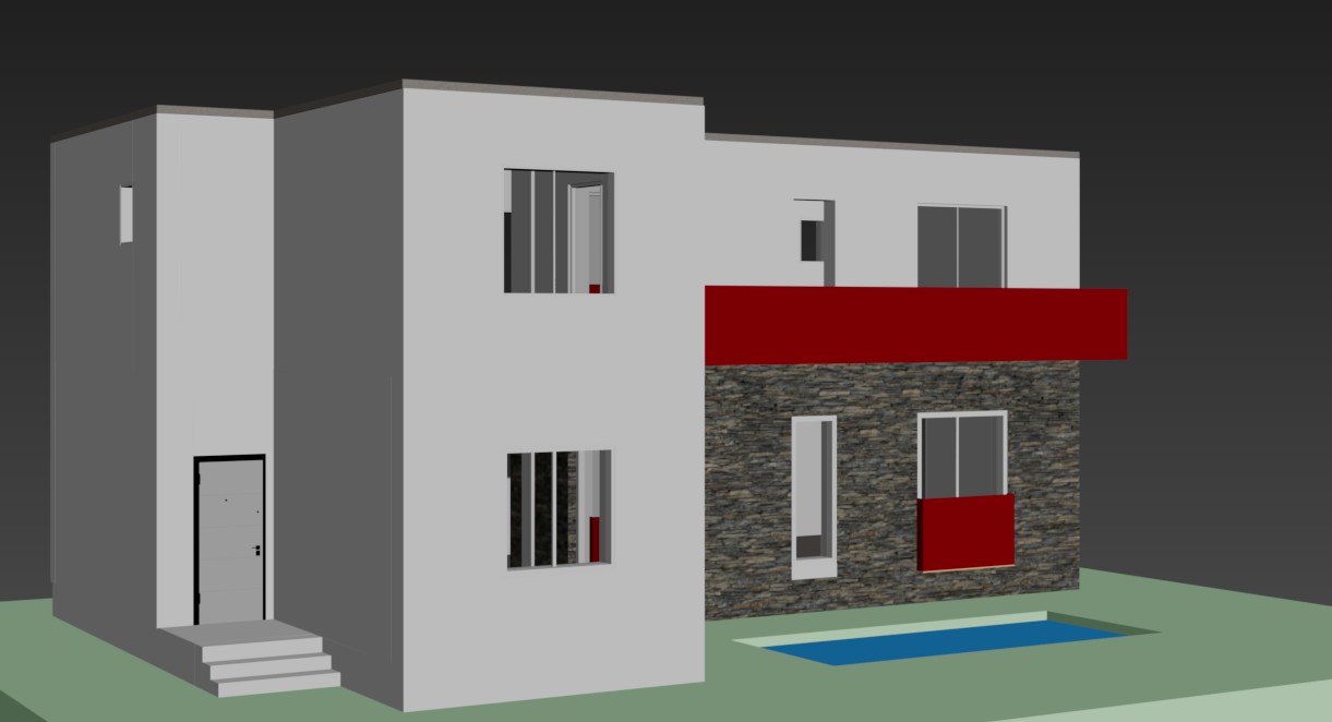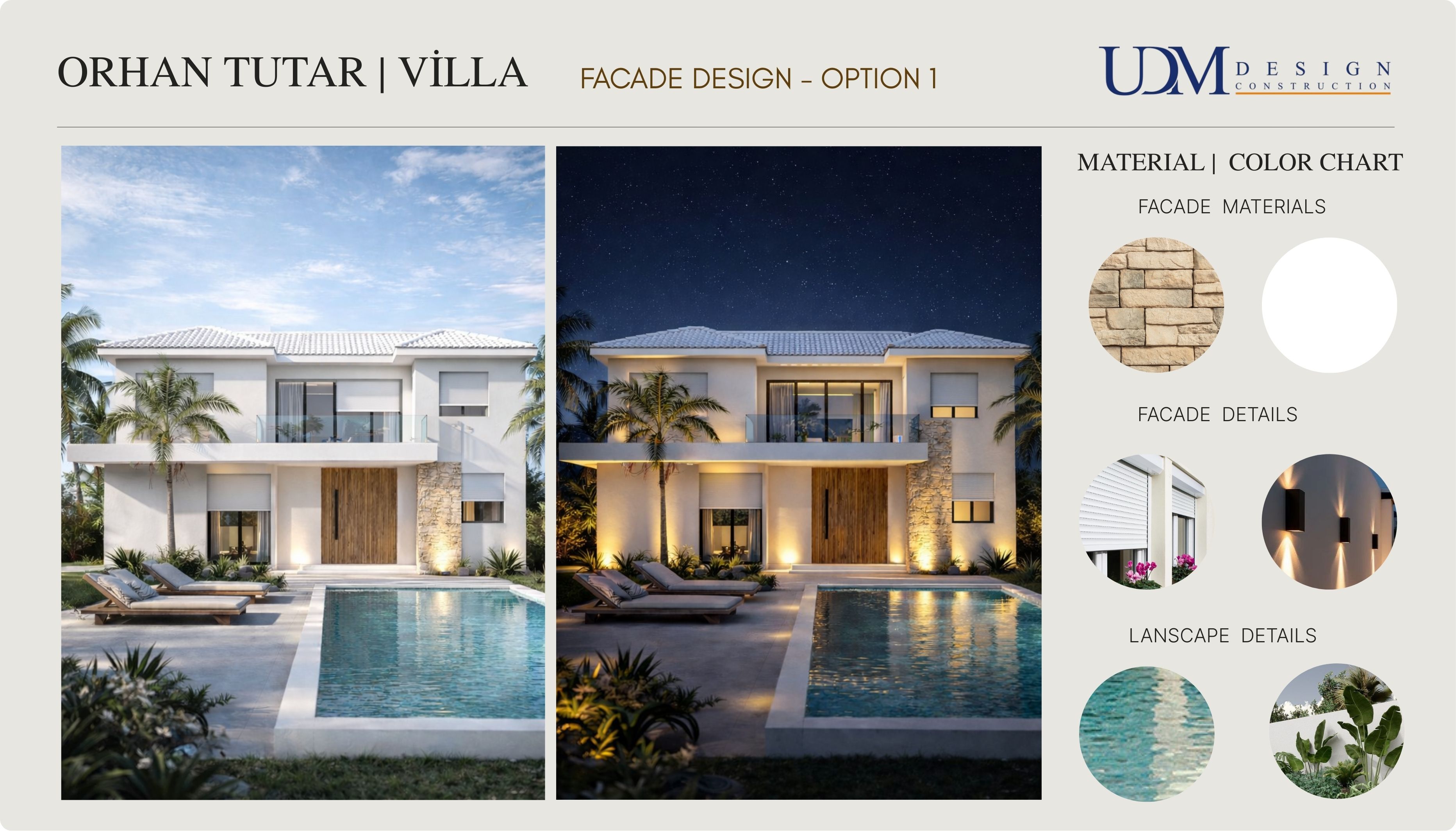 exterior shot build a pitched roof on the villa the entire facade will be white apply the stone shown in the moodboard to the areas where stone is visible the area i painted red will have white metal railings the facade windows will have electric white shutters add landscaping to the green area the pool will be in the blue area there will be stepping stones and ground lighting on the path leading to the entrance gate there will also be lighting on the facade wall make the render realistic and bright
