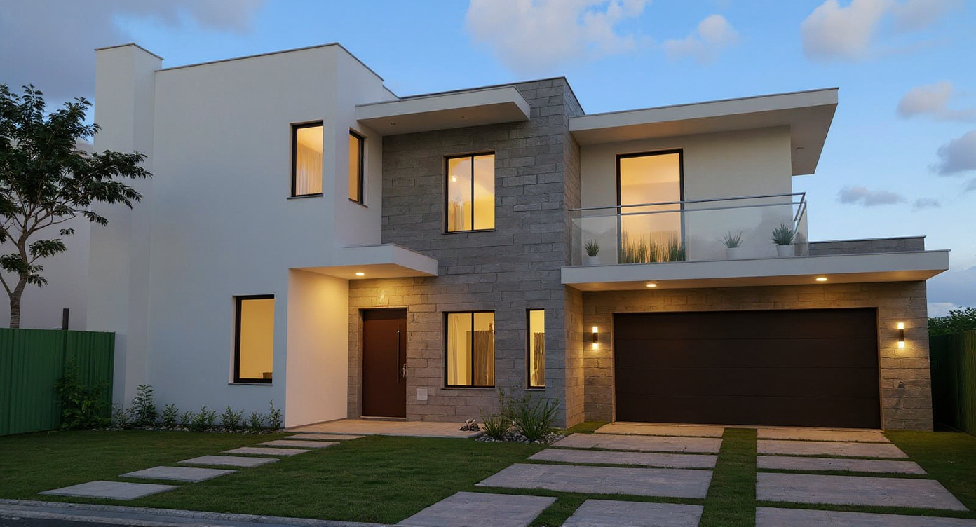 descripci n de la imagen casa moderna la imagen muestra la fachada de una casa moderna y elegante de dos pisos con una est tica minimalista y contempor nea arquitectura y materiales la casa presenta l neas rectas y vol menes geom tricos el dise o utiliza una combinaci n de materiales modernos paredes predomina el color blanco y un tono gris claro en los acabados exteriores madera oscura un panel de madera de color marr n oscuro es el punto focal de la entrada principal enmarcando la puerta vidrio grandes ventanales de piso a techo con marcos oscuros dominan el lado izquierdo de la fachada permitiendo mucha luz natural al interior barandales el balc n del segundo piso tiene barandales de vidrio transparente planta baja la entrada principal est marcada por el gran panel de madera a la derecha de la entrada se encuentra un amplio garaje cubierto con una puerta cerrada iluminado por luces empotradas en el techo que crean un ambiente c lido una rampa de acceso al garaje est pavimentada con grandes losas de concreto separadas por tiras de c sped planta alta presenta una combinaci n de paredes grises y blancas hay un balc n sobre el garaje con una puerta corrediza de vidrio y dos macetas con plantas decorativas un n mero o c digo de lote fb 15 est visible en la pared sobre el garaje paisajismo y entorno el jard n delantero est muy bien cuidado con c sped verde y una variedad de plantas ornamentales bajas a la izquierda de la casa hay una serie de escalones flotantes de concreto que conducen a la puerta principal la casa se encuentra en una calle pavimentada y se pueden ver otras casas de estilo similar a los lados sugiriendo que es parte de una urbanizaci n o barrio residencial moderno en general la imagen transmite una sensaci n de lujo dise o sofisticado y pulcritud