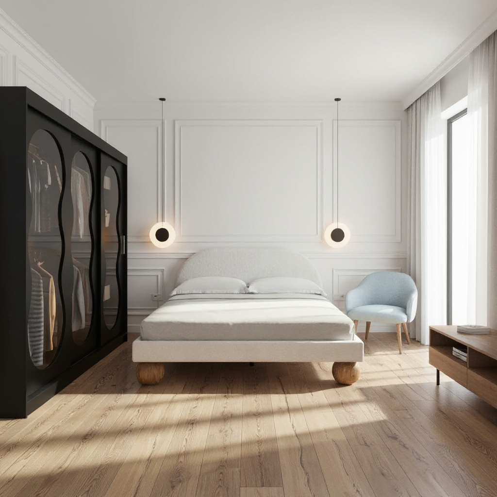 a wide frontal image of the wall with the closet the bed is on the right with two nightstands on on each side of the bed the walls are white and have white trim molding