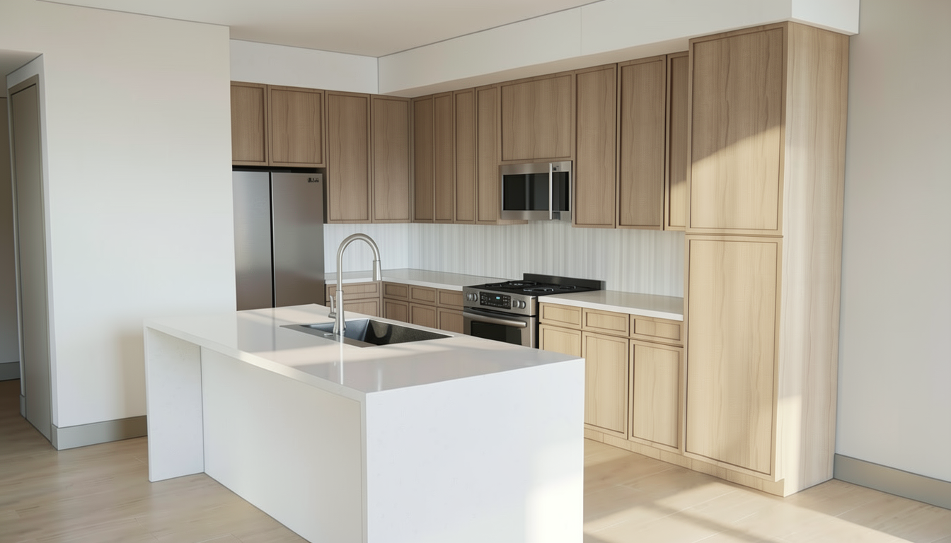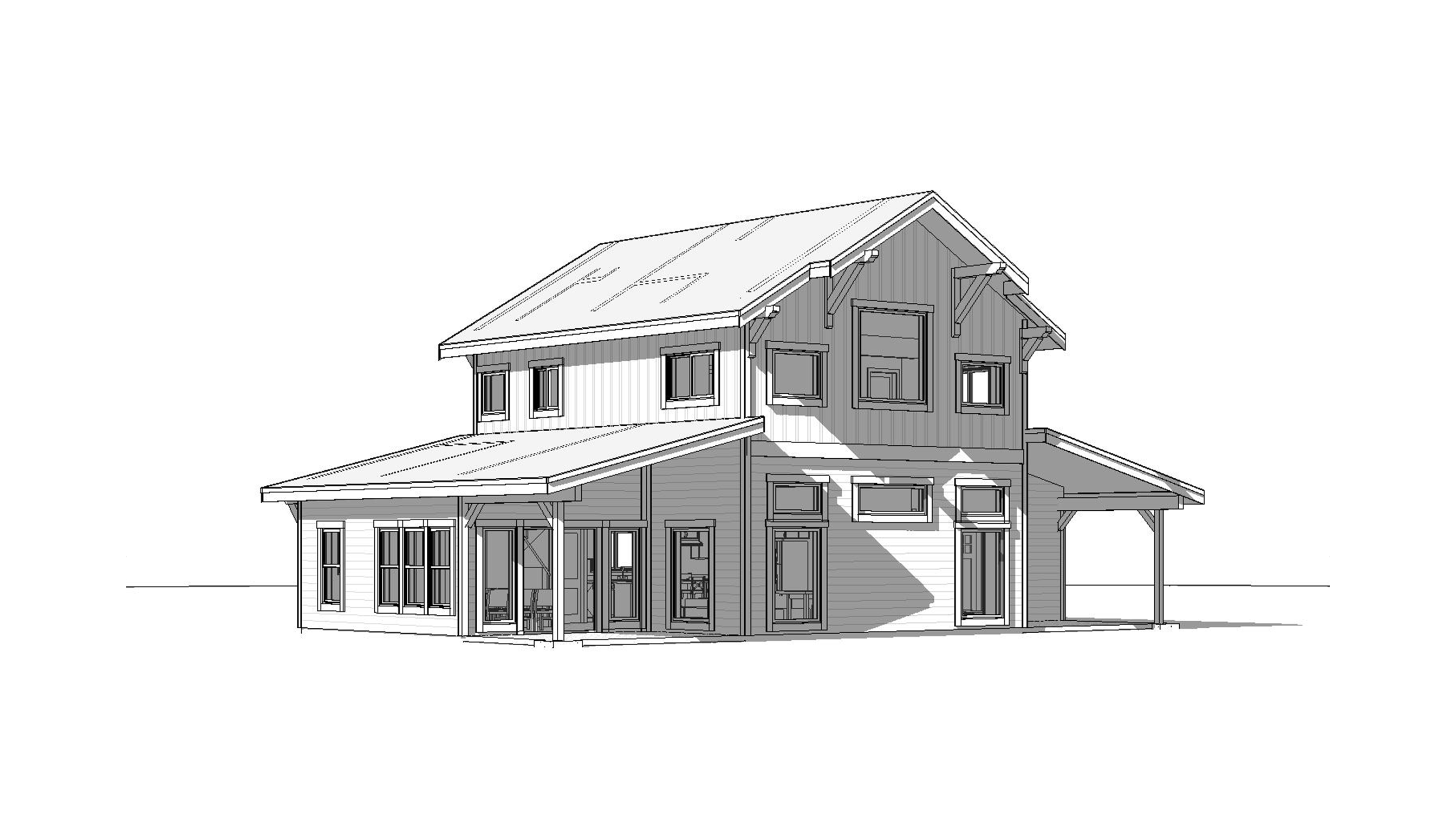 front view of a clean rustic barn home architectural exterior home rendered in cinematic day time lighting with bits of blue skies and sunlight coming through the clouds barn home in a countryside setting with faint streaks of light coming through trees in the surrounding area warm glow and reflections off of the windows blue sky with big billowy clouds warm select grade vertical wood siding green manicured landscape around structure with gardens and patches of grass black standing seam metal roof prominent trees in the background high fidelity photorealistic visualization crisp shadow falloff refined facade geometry soft atmospheric depth premium architectural photography mood ultra clean composition and materials black window trim flat roof photorealistic render small concrete path around the exterior of the cabin hide concrete footings grass in the foreground black window trim