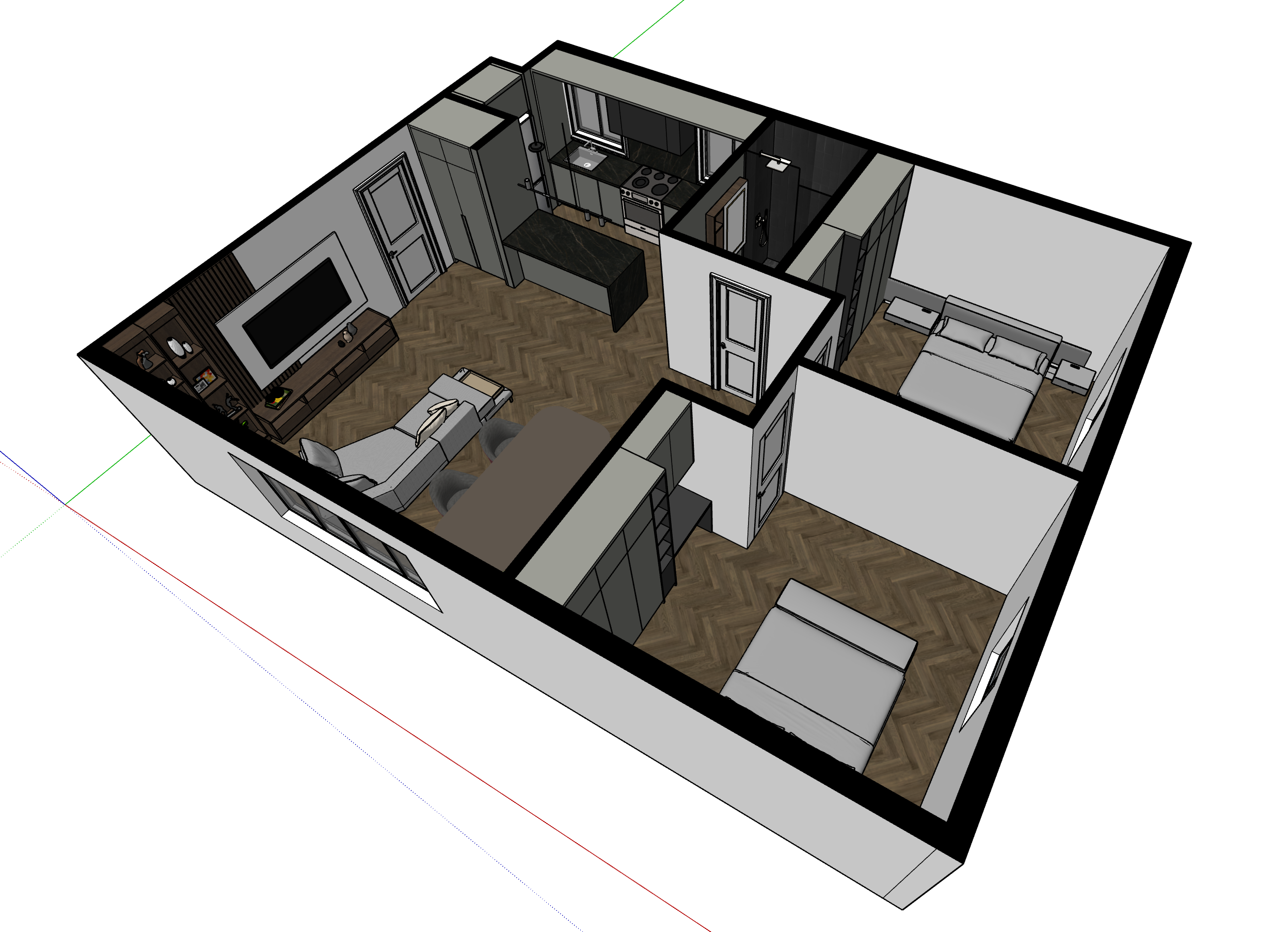 create a beautifully rendered 45 degree top down view of a modern apartment layout use warm grey earth tones for the wooden herringbone floors to create a cozy atmosphere incorporate dark marble countertops in the kitchen for a sleek elegant look use soft white tones for the walls to give a neutral yet sophisticated backdrop the kitchen and living area should have ample natural light to enhance the welcoming vibe all doors are white solid door no glass