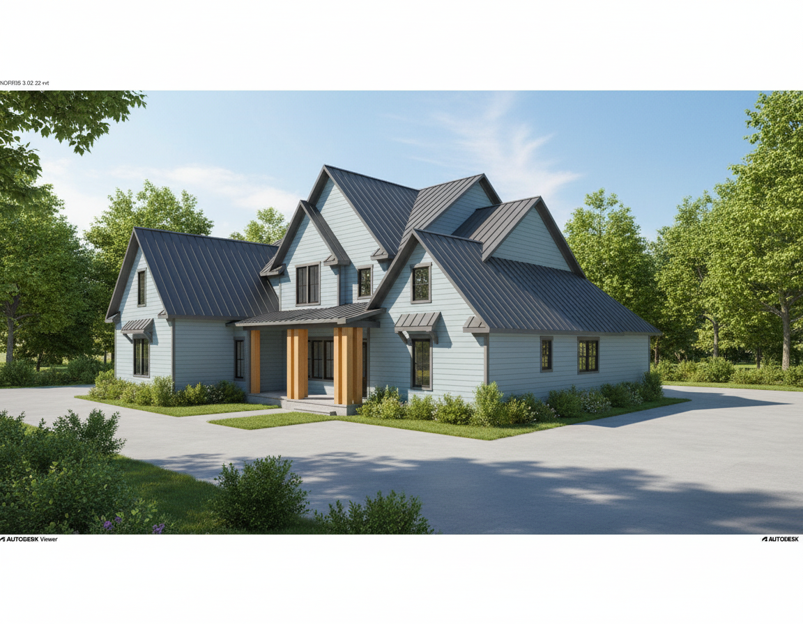 make photo realistic add driveway front walk landscaping with river rock and low mountains in background bright sun at front of house early afternoon asphalt shingle roof gable fascia trim is dark evergreen except for at front timbers dark evergreen trim and siding dark brown board and batten
