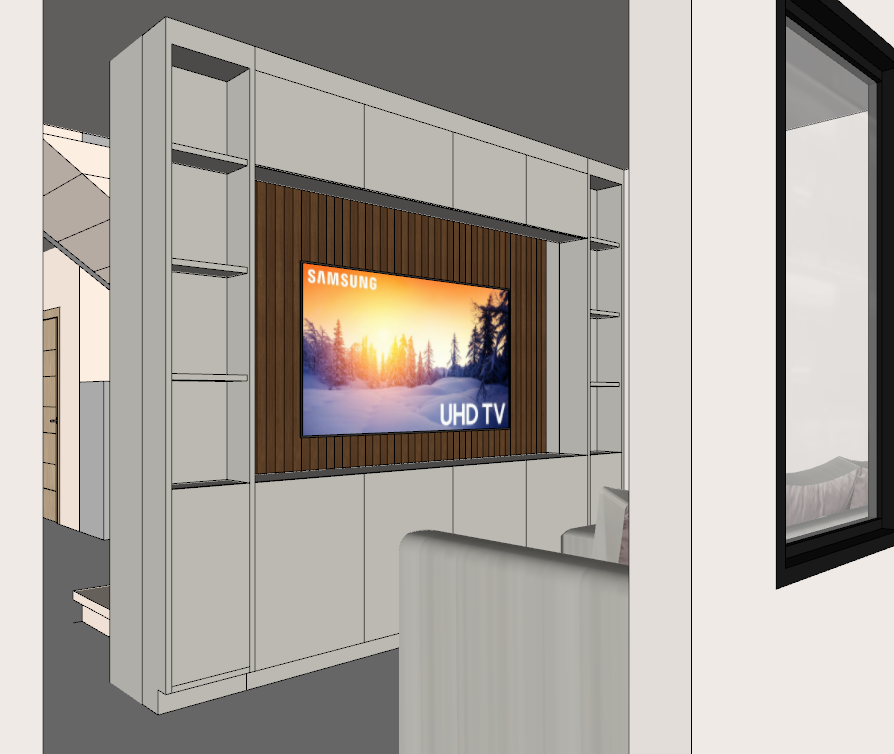 modernist interior shot modern minimalist render and add decorations and warm led strip lights on shelves for dramatic lighting and make the natural lighting facing the tv console cabinet architecture