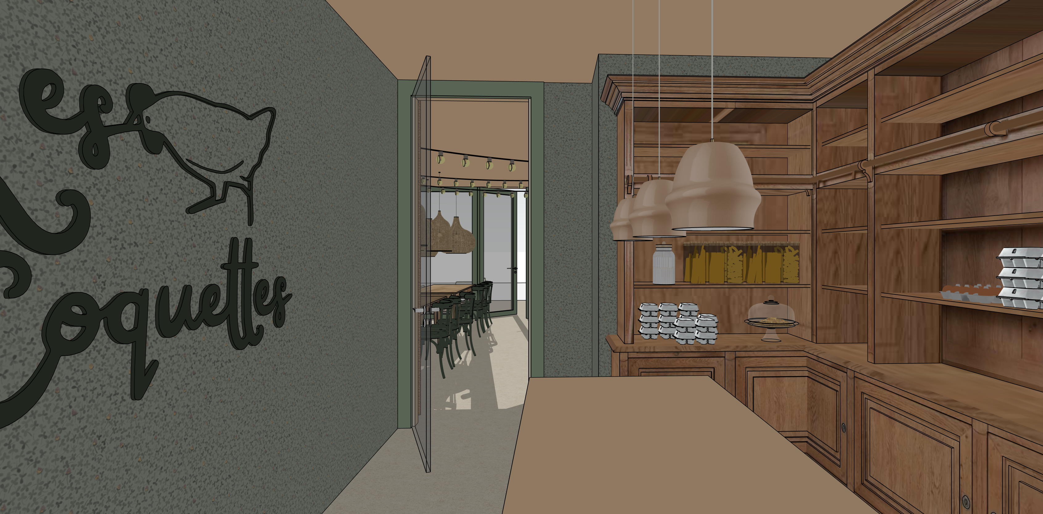 strictly preserve the original image and geometry exact same camera angle and framing no changes to architecture and any elements no modification to walls doors or openings keep all furniture exactly as is do not add or remove any objects no redesign no deformation preserve all original materials and colors no reinterpretation no new elements enhance only lighting and realism soft architectural photography style warm late afternoon ambient light soft diffuse shadows calm and balanced atmosphere subtle artificial ambient lighting only from the existing rattan pendant and ceramic suspensions lights warm soft glow realistic light diffusion no new light fixtures natural materials with subtle imperfections except the walls with mat wall paper slightly aged wood with light patina table grocery furniture realistic ceramic texture for the 3 pendants light above the foreground table brillant finish but same color as sketchup same floor behind door no overly perfect surfaces rural outdoor background with fields inspired by the alsatian sundgau landscape soft natural horizon coherent with interior lighting visible only through existing openings no new windows or exterior views keep all the existing ceiling and the joineries in the same color of sketchup 50mm lens shallow depth of field slight film grain soft contrast natural color grading