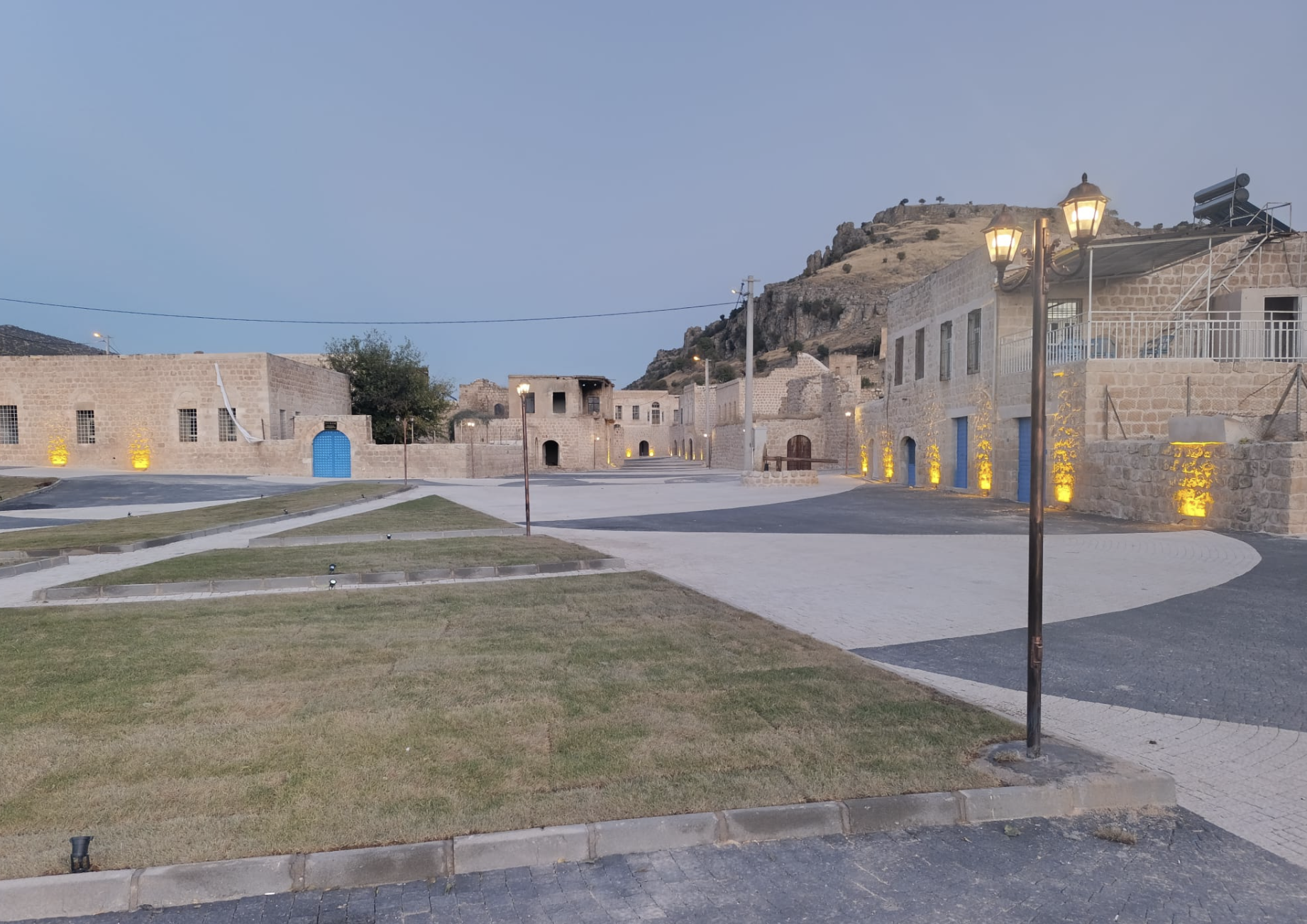 sustainable design exterior shot evening light old ruin city with yellow led lamps on the ground turistic info and benches on grass corten steel bars architecture