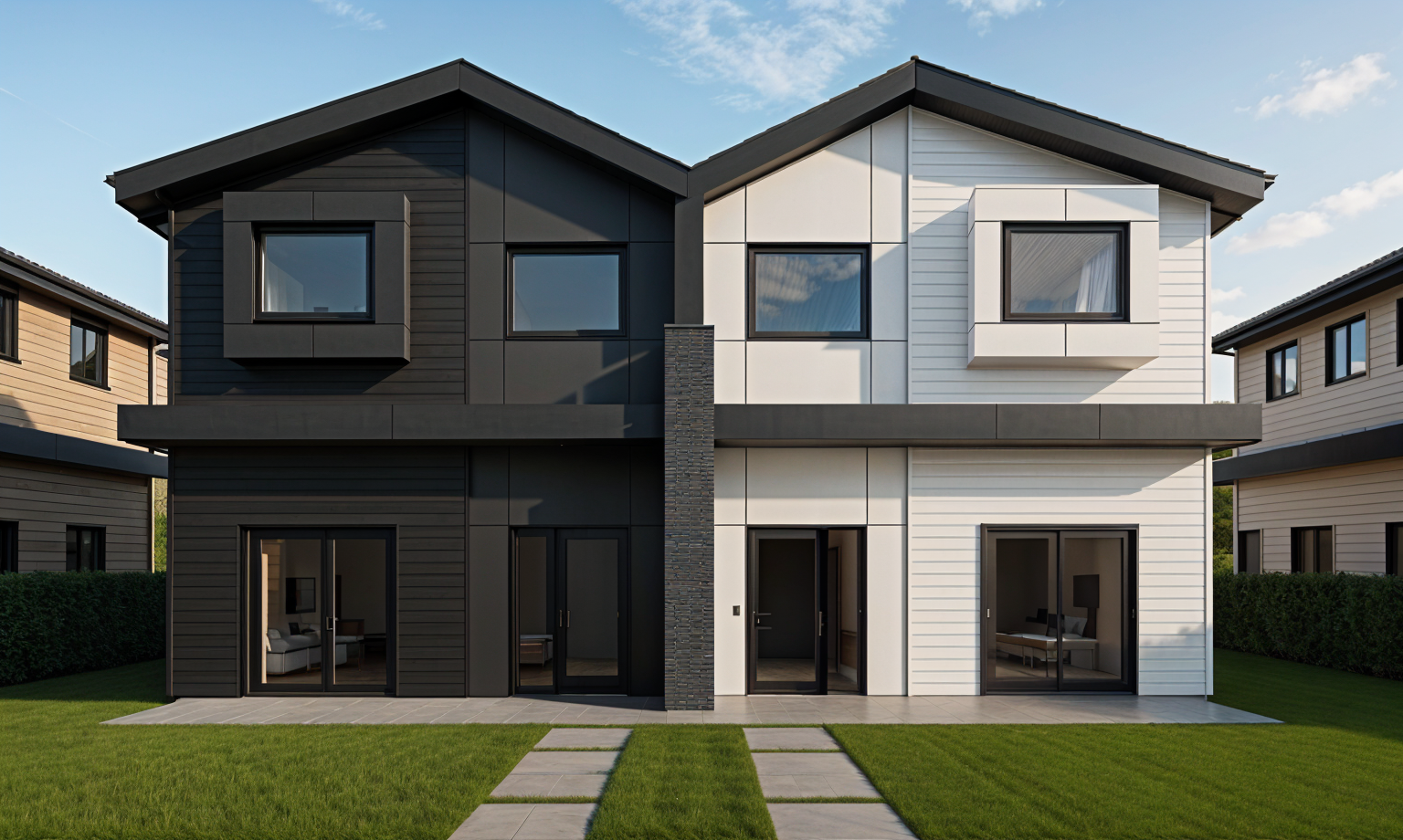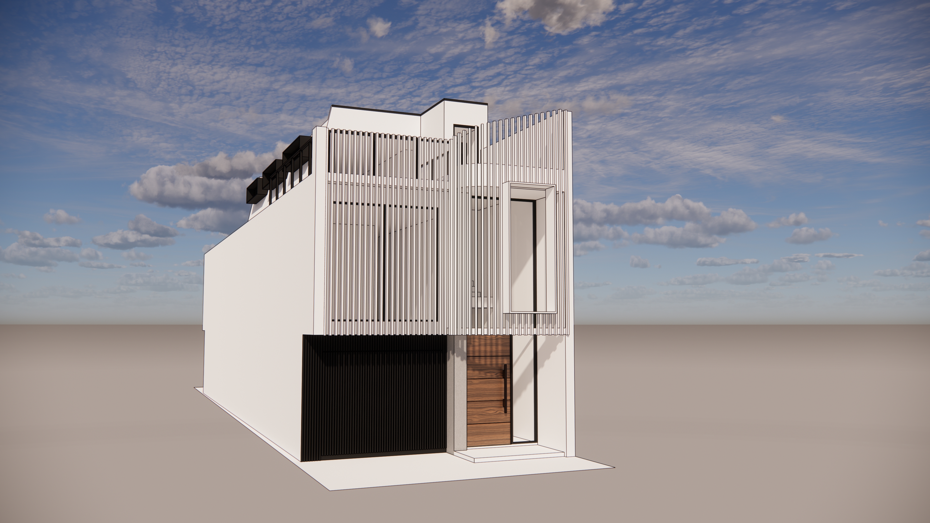 render a modern architectural building with a minimalist design featuring a facade of sleek vertical slats use a color palette of bright white for the walls and slats contrasting sharply with deep black windows and lower panels add a natural wooden door with rich brown hues for warmth the sky is filled with soft scattered clouds in a bright blue atmosphere creating a tranquil and serene setting timber garage door