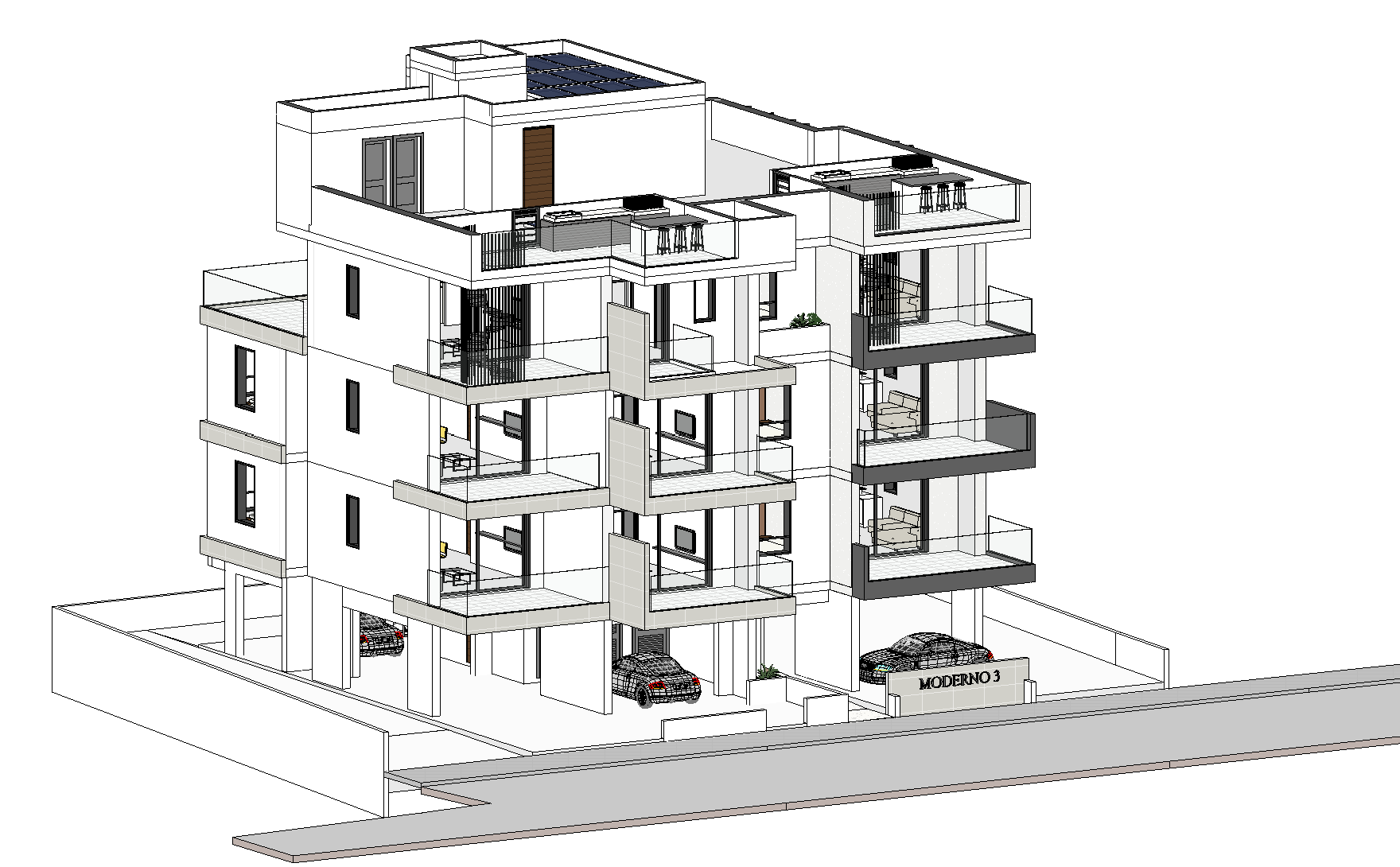 luxury contemporary mid rise residential apartment building elegant white limestone and smooth plaster facade exposed architectural concrete vertical core large floor to ceiling glass windows transparent glass balcony railings light grey concrete effect ceramic tiles on the floors vertical slats of dark grey color for the right hand side balconies ceramic tiles of light grey color for the left hand side balconies refined modern detailing premium materials realistic proportions located in a lightly dense urban city environment surrounded by modern neighboring buildings of different heights greenery detailed street scene with asphalt road sidewalks curbs parked cars a few moving cars pedestrians walking street trees and subtle landscaping urban furniture integrated naturally into the cityscape clear blue sky minimal clouds bright direct sunlight crisp sharp shadows high contrast lighting vibrant natural colors ultra photorealistic highly detailed architectural visualization preserve original architectural geometry