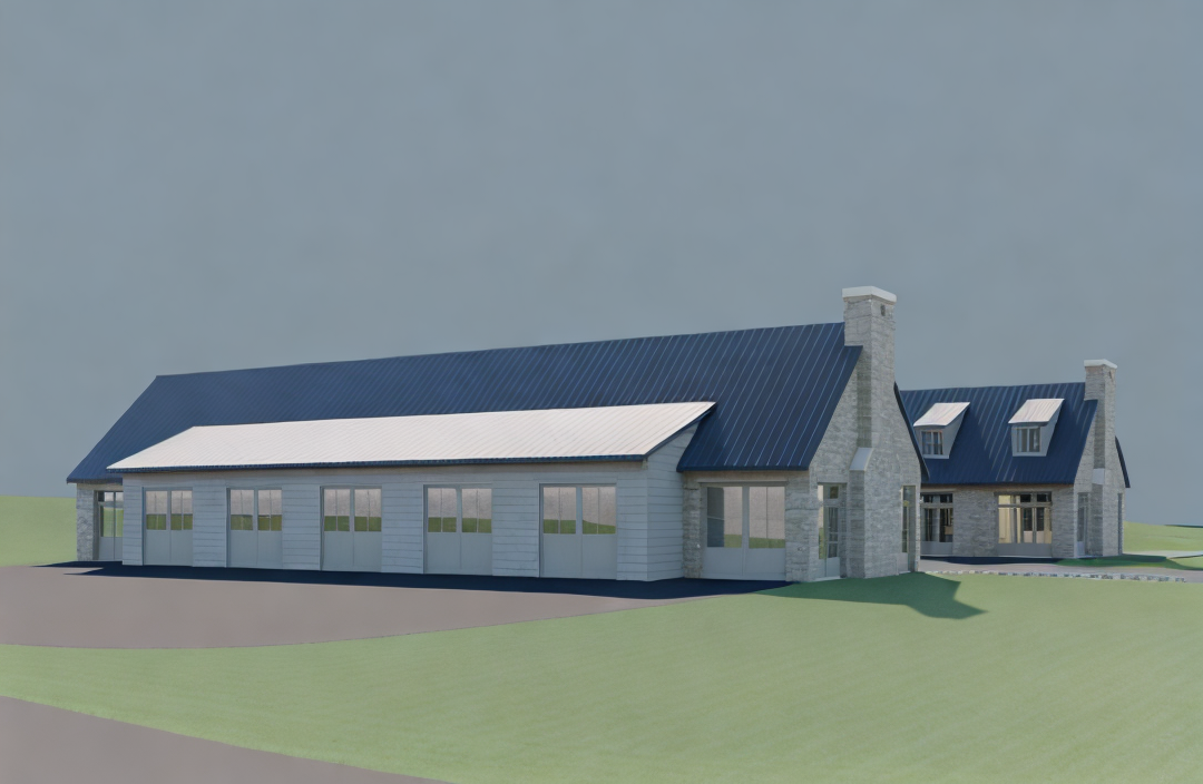 north woods natural landscaping large scale stone exterior standing seam metal roof paved driveway flagstone patios on the sides of the home natural grass where green all exterior doors and windows in pella portobello cladding note additional driveway located at front of home right of image architecture