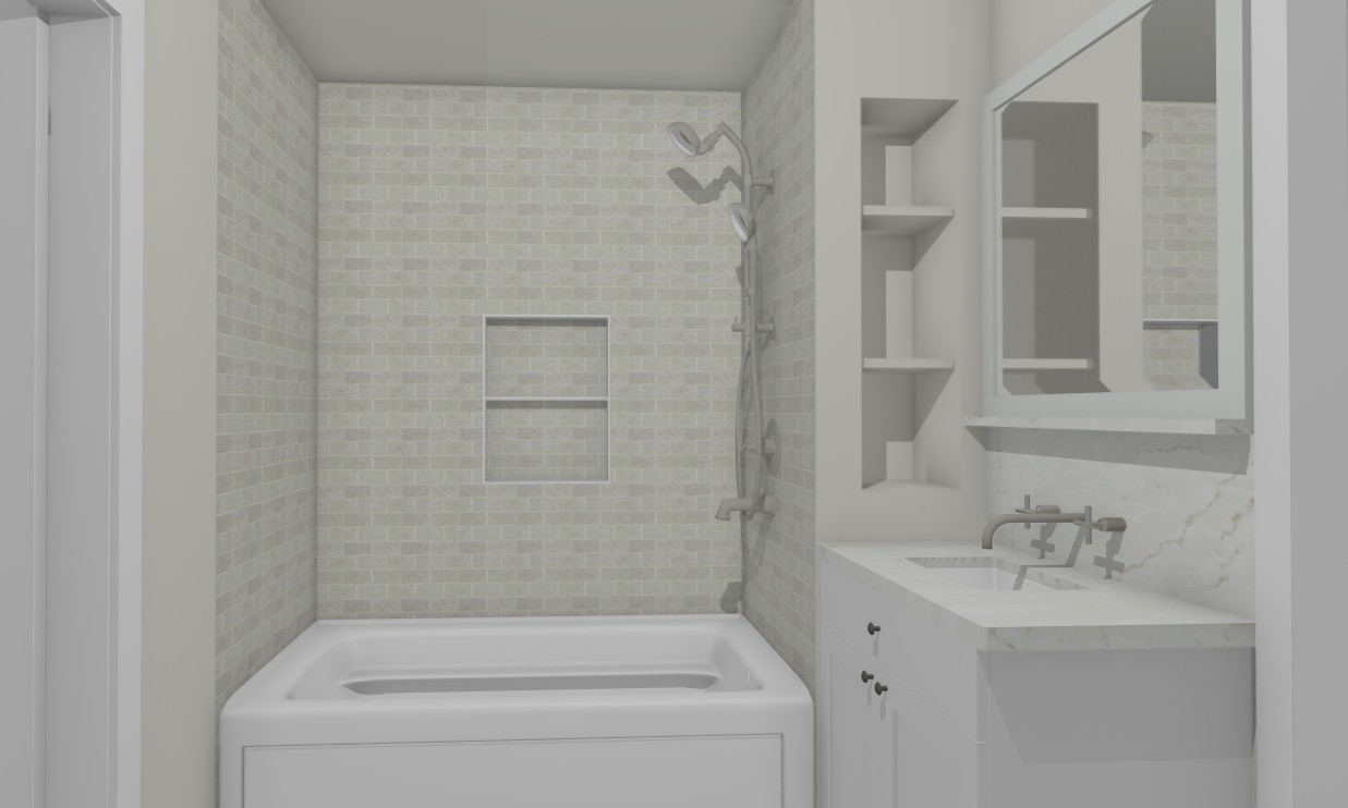 rendering shows a bathroom with neutral tiles and sunlight streaming in from behind the viewer immediately on the left is a doorway followed by a small patch of wall painted in benjamin moore white dove beyond wall is an alcove white tub all of the walls surrounding the tub are an creamy subway tile with gray understones centered on the back wall is a niche that contains a bottle of shampoo on the right wall of the alcove is a shower faucet and tub faucet in polished nickel a glass wall sits on the near edge of the tub and goes to the wall on the right wall is a white vanity with a marble countertop and matching marble backsplash the marble is white with subtle gray veining about 12 inches above the vanity is a small shelf also in matching marble immediately above the shelf is a mirror to the left of the vanity are shelves recessed into the wall the bathroom is well lit 8k view and hyperrealistic