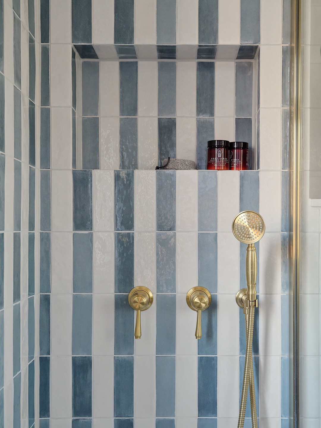 please make a bathroom with by combining these images please lay the tiles stripped with pink and white tiles in a bejamat format