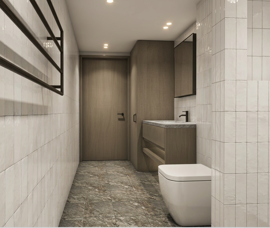 add only wall light on the left side of mirror above the sink keep the style of original image dim spotlights a bit