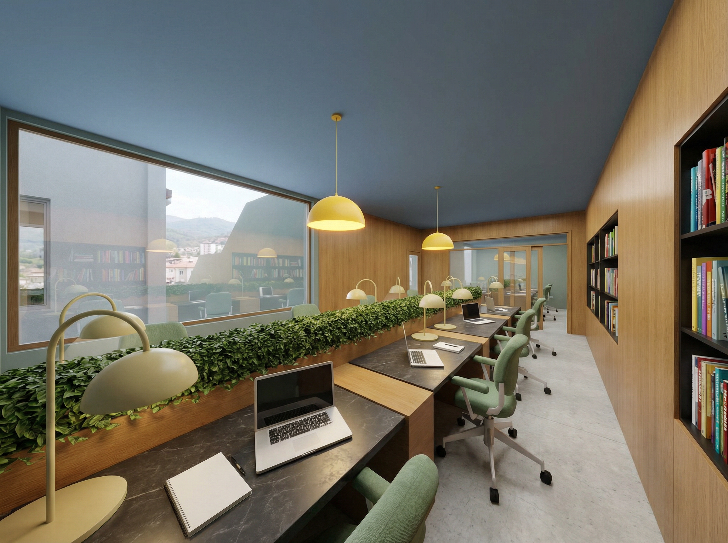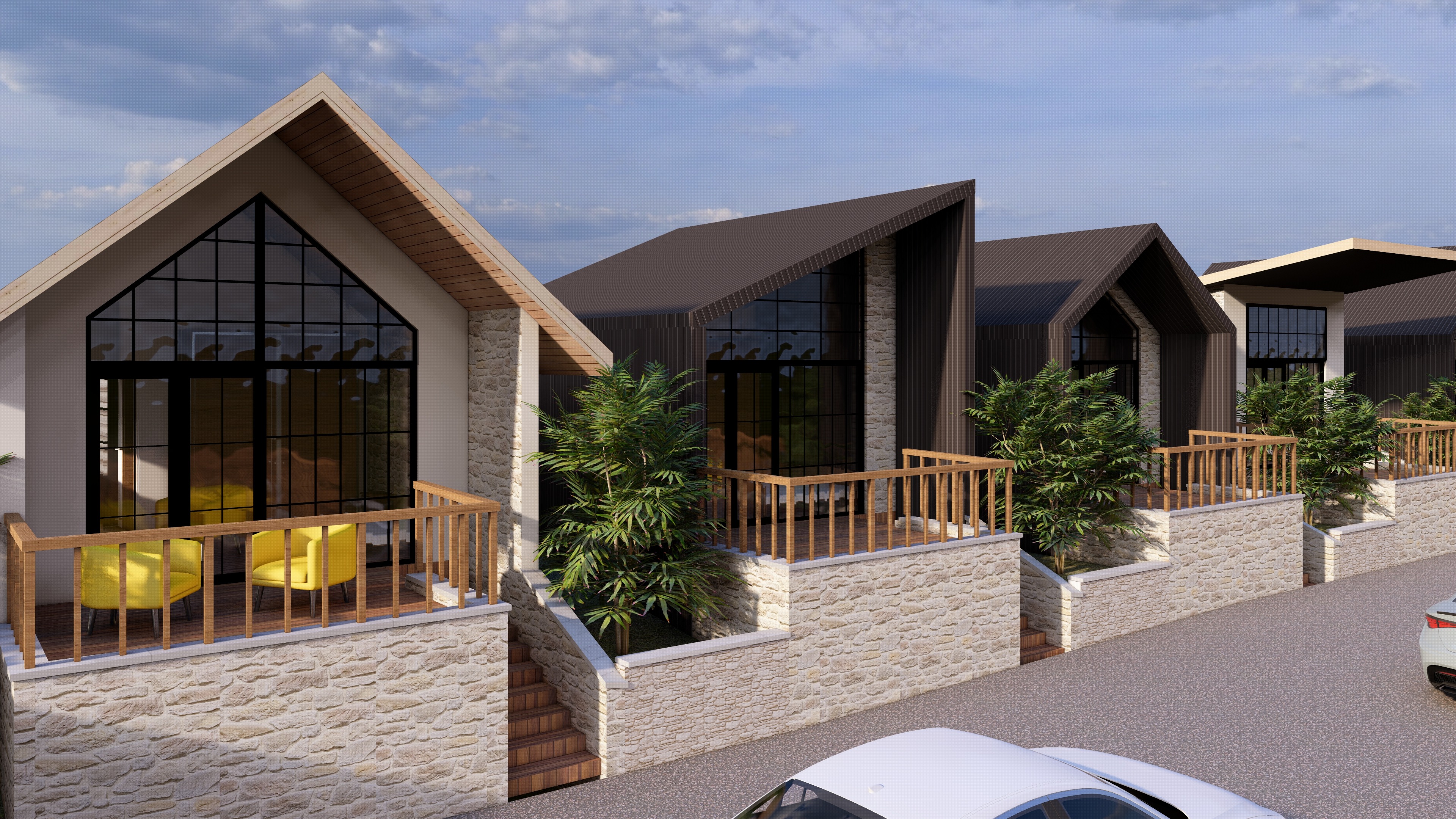 add trees and vegetation proportional height to buildings behind to give it context and hide horizon add interior warm lighting and evenly spaced wall sconce only 2 wall sconce for every unit of equall height from from ground as well