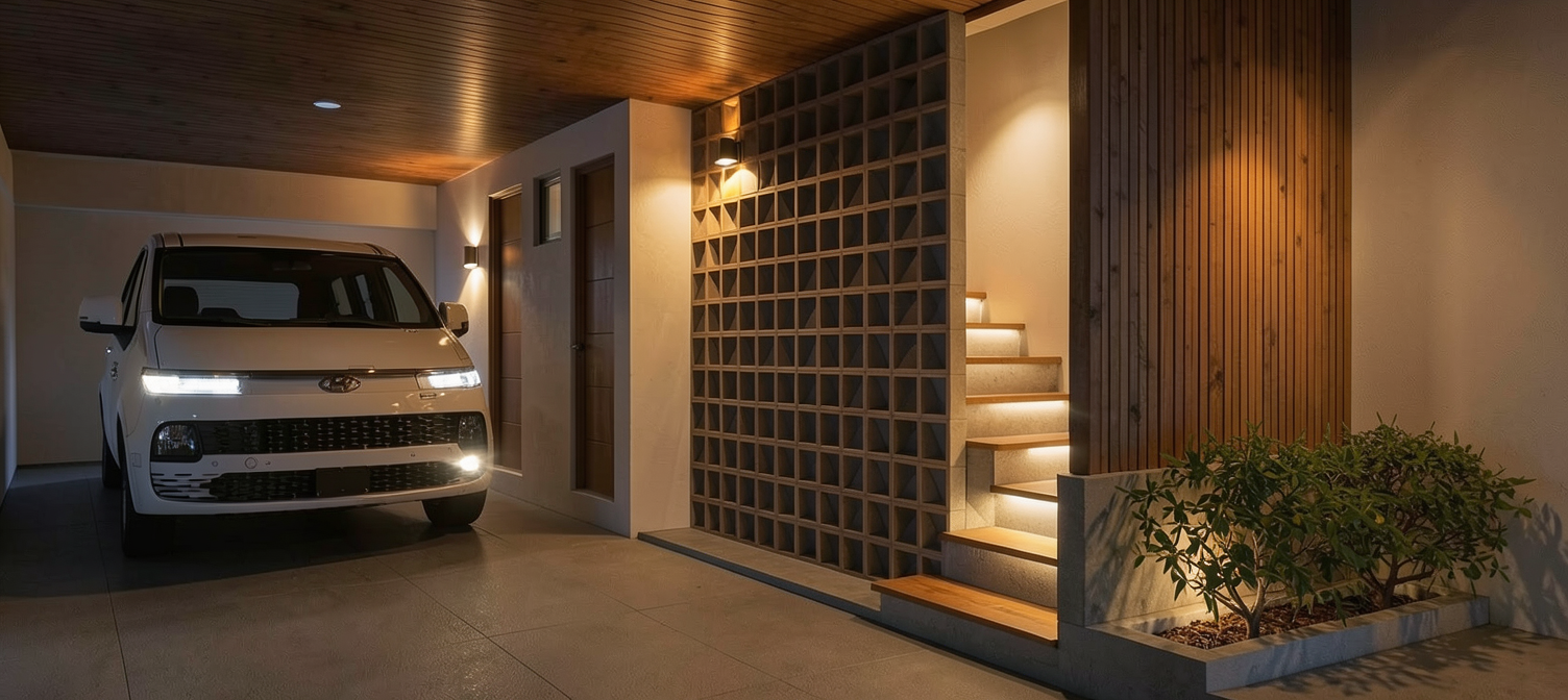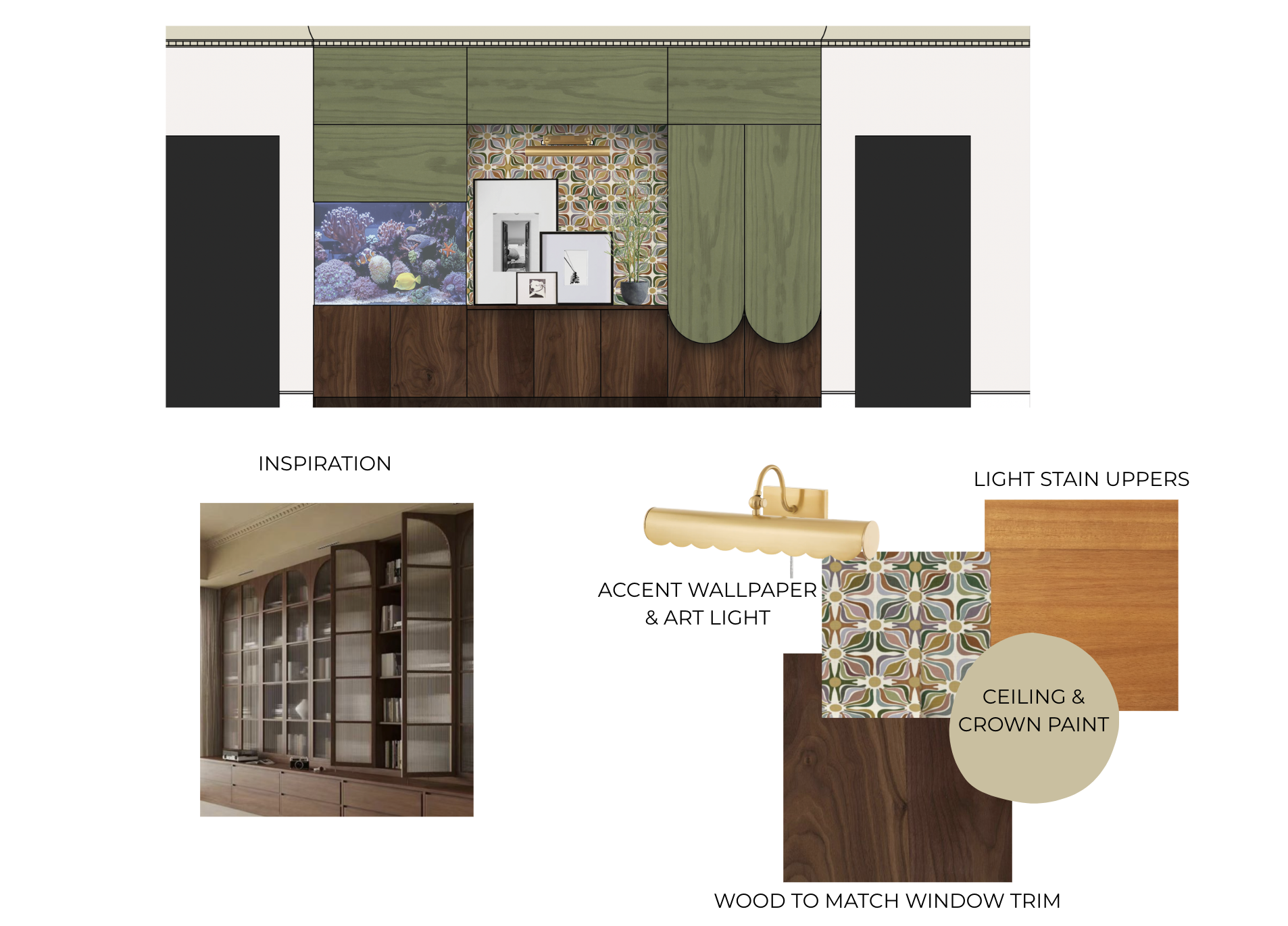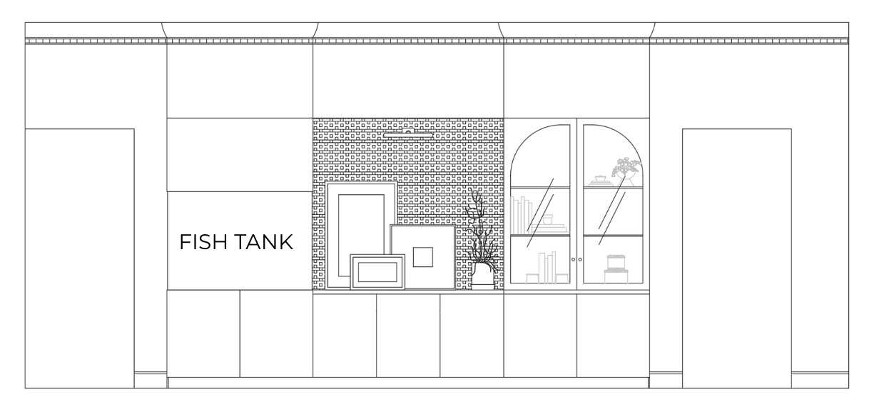 exterior shot light maple wood on top section of cabinetry and glass door section dark wood on lower section of cabinetry salt water fish tank on left side wall paper in center section on the back wall with art and decorative light fixture