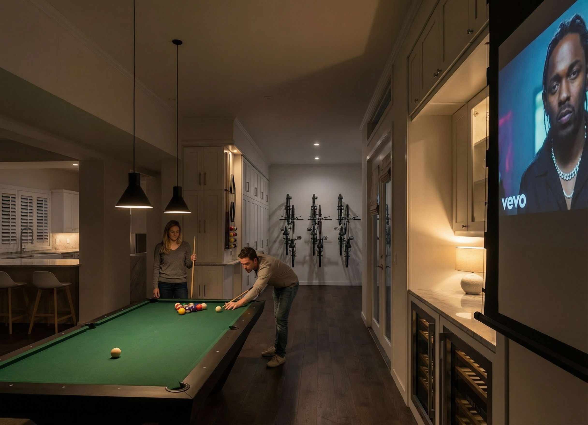 clean modern cabin architectural exterior home rendered in cinematic vibrant daytime lighting with big clouds in the sky cabin in the woods warm glow and reflections off of the windows rustic select grade vertical wood cedar siding green manicured landscape around structure with gardens and patches of grass black standing seam metal roof prominent cinematic forest with big douglas fir trees and ferns and moss surrounding behind the house in the background high fidelity photorealistic visualization crisp shadow falloff refined facade geometry soft atmospheric depth premium architectural photography mood ultra clean composition and materials dark trim around windows photorealistic render