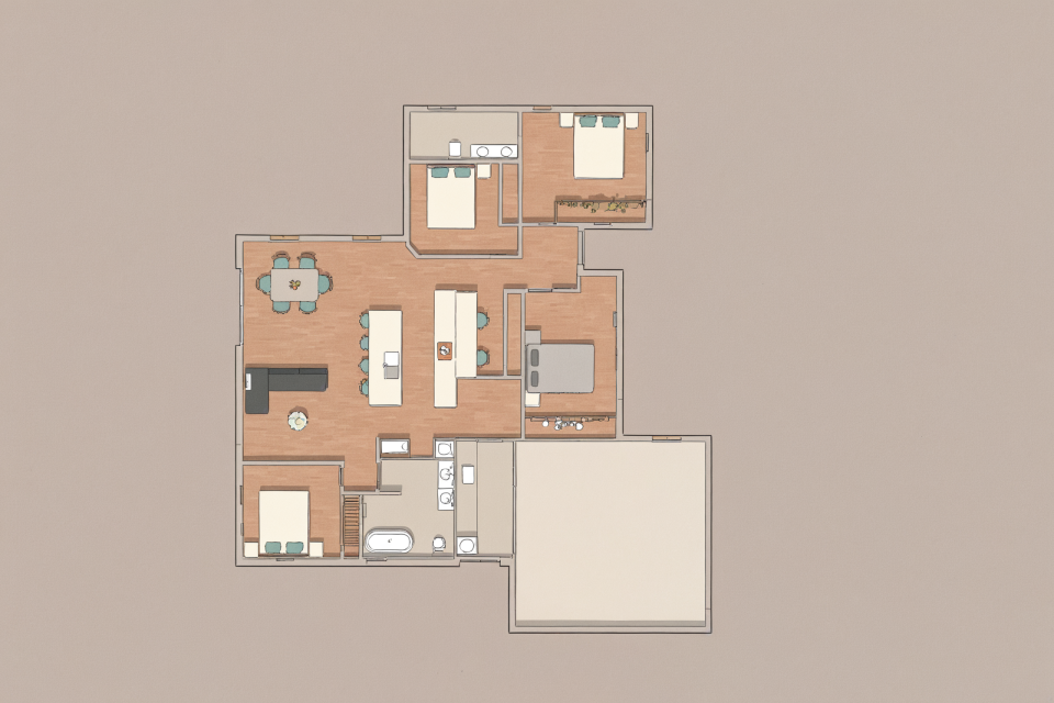 convert this floor plan into a realistic isometric 3d view of a full house show the space from an elevated angle with furniture walls and details visible modern style light colours lansdcape use the same furniture as shows on the plan do not change the orientation of the floorplan