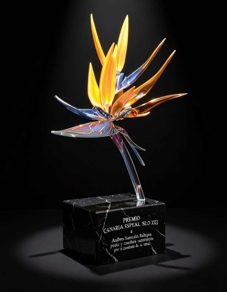 the aim is to create a trophy maintaining the exact shape of the strelitzia from the photograph finished entirely in highly polished monochrome stainless steel mounted on a stylized square prism of absolute black south african marble bearing the inscription premio canarias especial siglo xxi a andr s s nchez robayna poeta y catedr tico por el conjunto de su obra creativa the background will be a nocturnal black illuminated only by a side spotlight that will make it shine