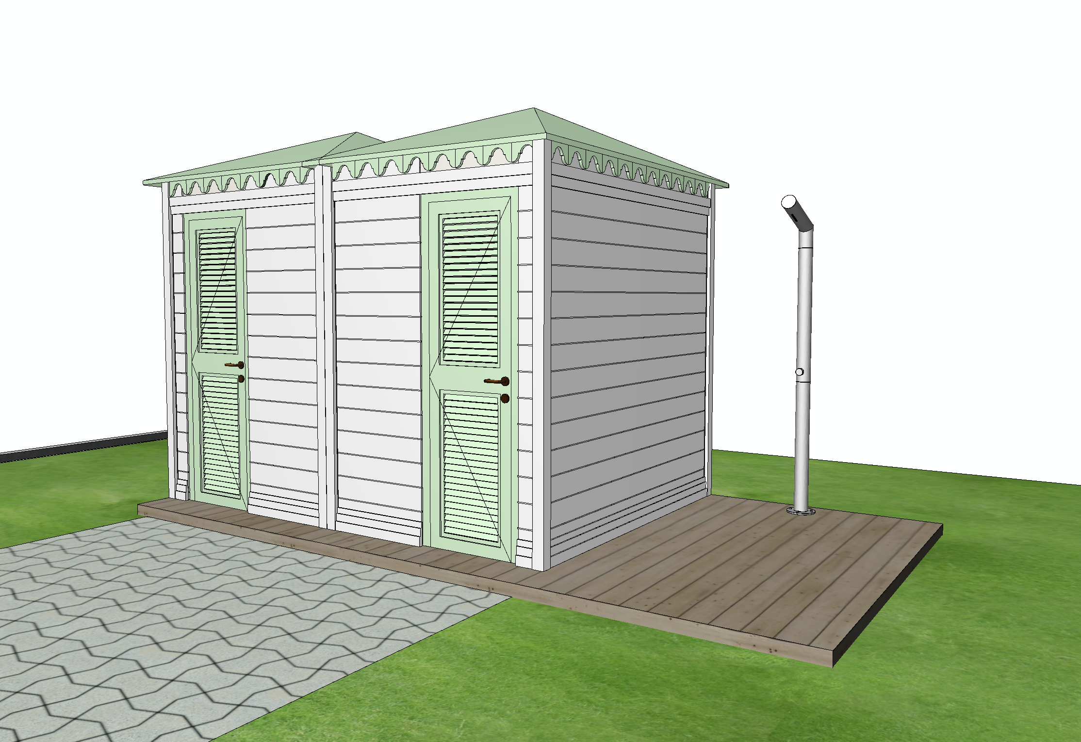 ultra photorealistic render of the exact cabana structure shown in the reference model do not change or modify any geometry proportions glazing layout siding doors mullions roof shape hardware or the camera angle keep the model exactly as it is all exterior surfaces clean white color siding columns beams trims full height glass sliding doors with transoms exactly as modeled interior curtains remain exactly as in the model but with a dark contrasting trim along the edges keep the style and positions unchanged place the cabana in a luxury west palm beach resort setting bright tropical daylight lush palm trees manicured landscaping subtle resort buildings in the distance realistic shadows and reflections on glass clean paver flooring hyper realism crisp detailing premium resort ambiance only enhance materials and environment no design or geometry changes