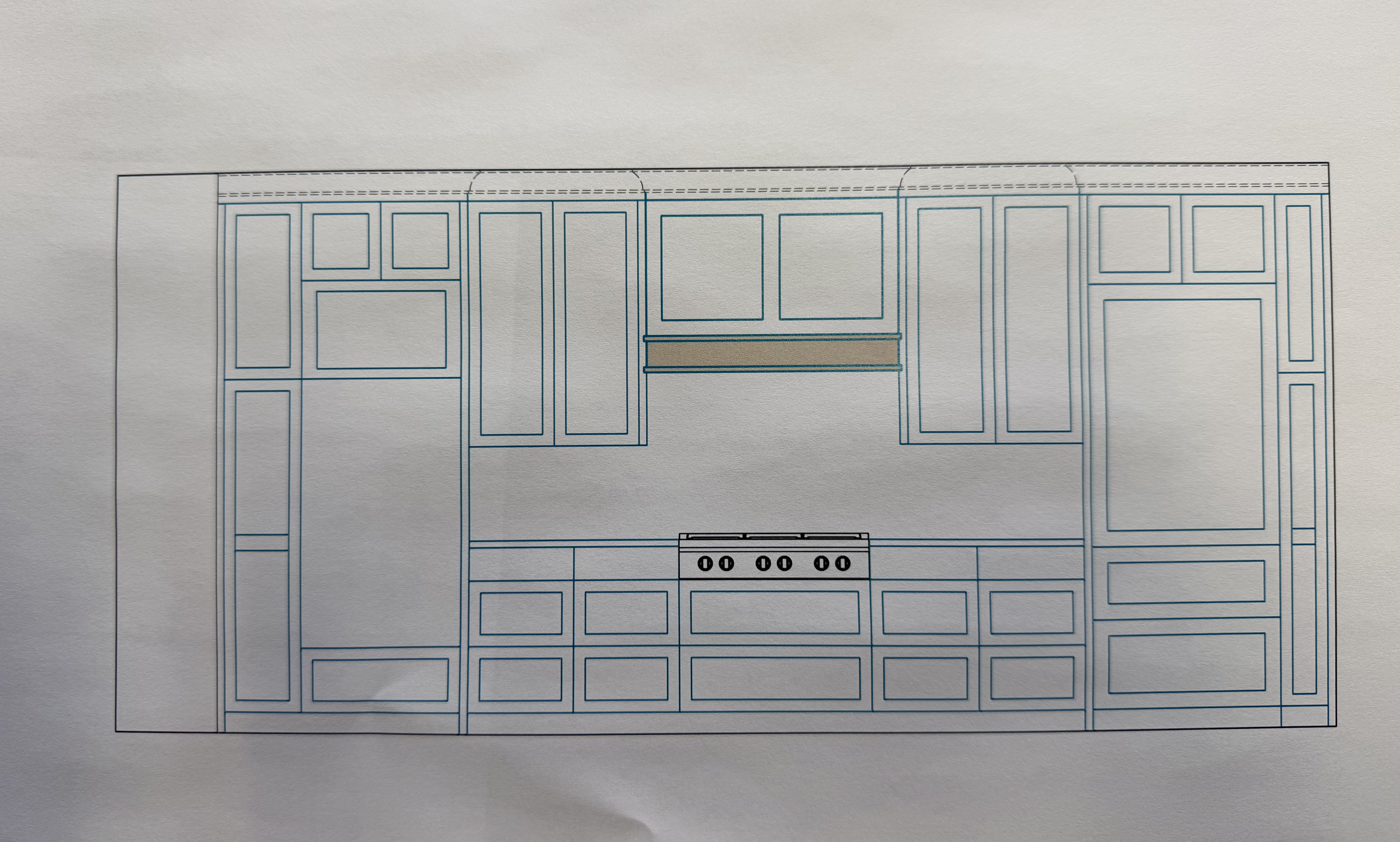 white ceiling with recessed lighting painted white cabinets oak hood over stove frame and panel doors white walls white oak 8 inch plank flooring grey stone countertop and backsplash