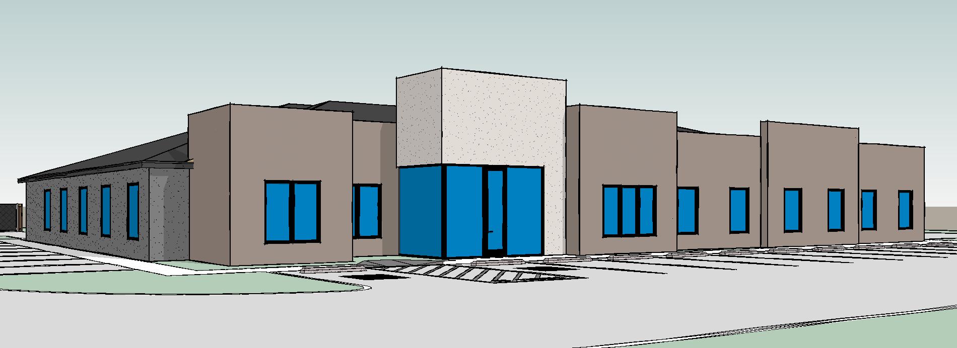 modernist exterior shot office building with brick stucco glass and landscape like west texas architecture
