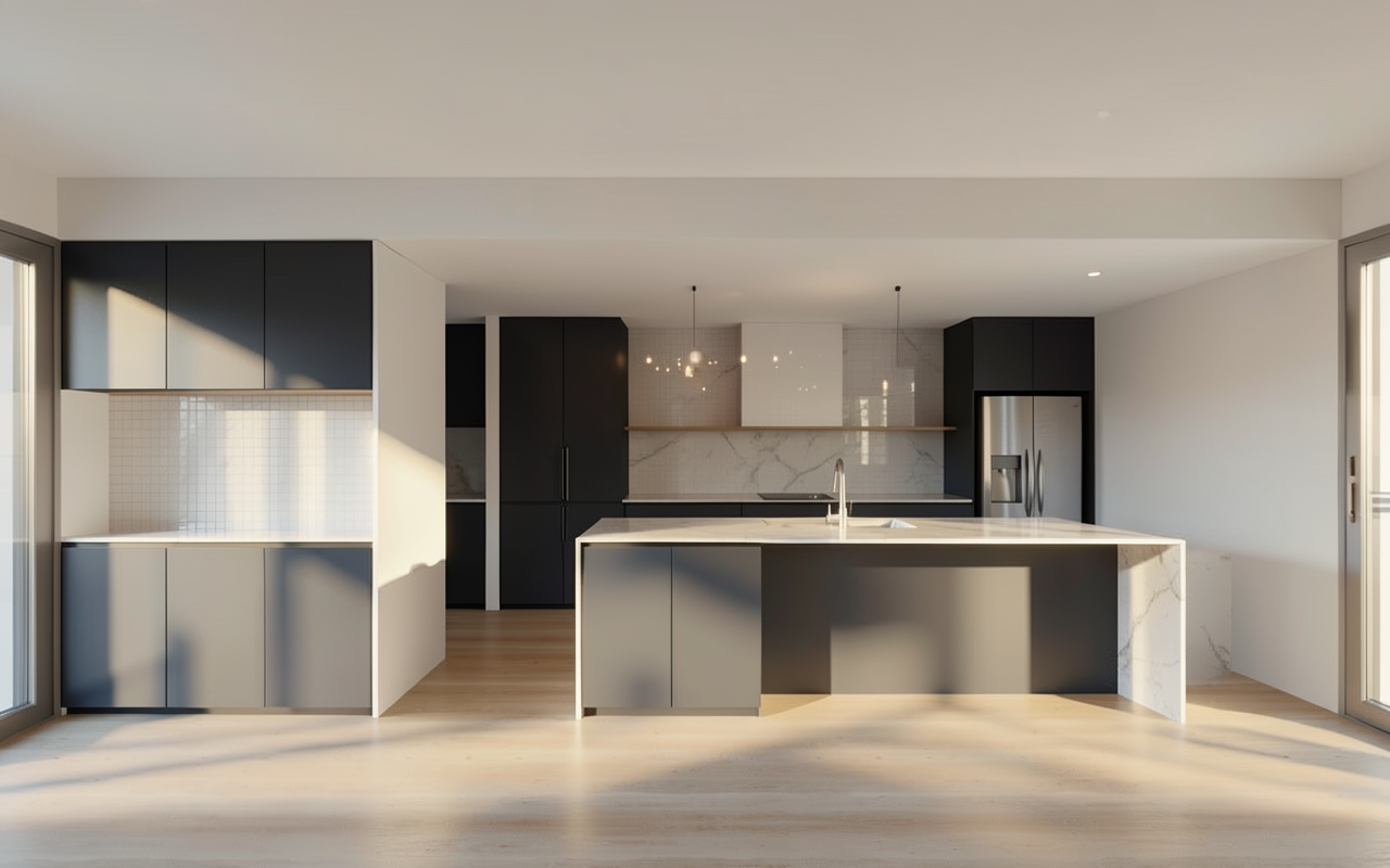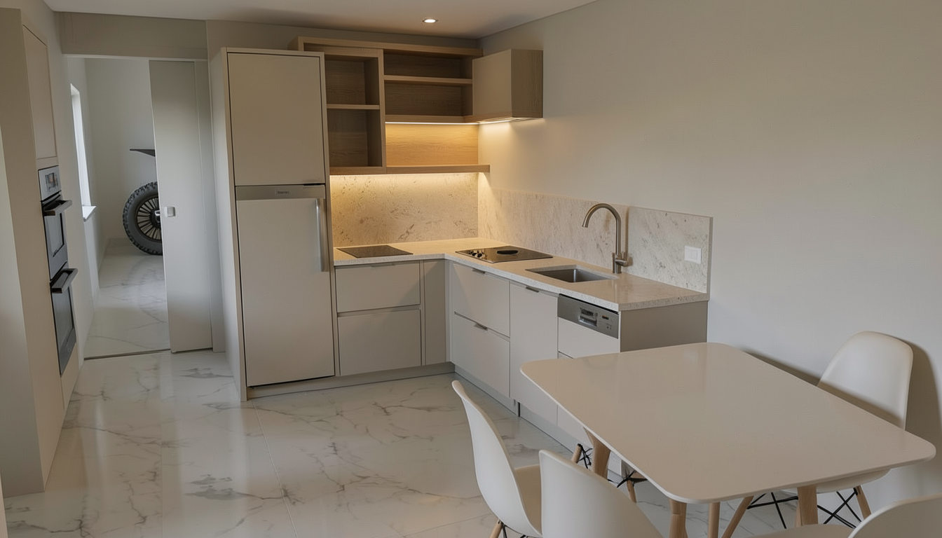 use the uploaded image as strict geometry and layout reference do not change room size cabinet widths wall positions or appliance locations airbnb optimized modern built in l shaped kitchen timeless durable easy to clean and realistic to build everything must feel calm robust and professionally designed layout locked tall cabinet on the left with integrated fridge built in oven and microwave in tall cabinet corner cabinet connecting both sides long side with induction cooktop with integrated ventilation in the cooktop itself bora siemens aeg style three drawers directly under the cooktop one shallow two deep integrated dishwasher sink with drawers beside and below cooktop ventilation critical ventilation is fully integrated into the cooktop flat rectangular induction cooktop flush mounted into the countertop no separate ventilation elements no wall mounted hood no ceiling hood no round buttons or strange details clean realistic european design cabinet design completely flat handle less fronts everywhere no framed or panel style doors consistent drawer rhythm across the full kitchen slightly recessed shadow gap instead of visible plinth materials colors soft greige beige matte cabinet fronts light warm stone or quartz countertop same stone used as backsplash higher behind sink and cooktop natural light oak or warm wood veneer for shelves and niche no glossy finishes no strong contrasts upper area no traditional upper cabinets only open shelves and recessed niche limited number of shelves thick solid shelves for a robust look minimal styling no clutter faucet sink low profile robust faucet brushed metal or soft dark tone simple durable design flush mounted sink lighting warm indirect led lighting under shelves and inside niche soft ceiling lighting cozy evening atmosphere realistic residential lighting not showroom style scandinavian mediterranean modern calm warm timeless designed for frequent guest use functional intuitive easy to maintain clean and uncluttered camera eye level interior photo natural perspective realistic shadows and depth bright but soft airbnb marketing look negative prompt viktig lim inn no wall mounted hood no ceiling hood no downdraft slot behind cooktop no round ventilation elements no buttons on countertop no layout changes no island no handles no framed cabinet fronts no glossy white kitchen no industrial style no dark cabinets no showroom look no decorative clutter