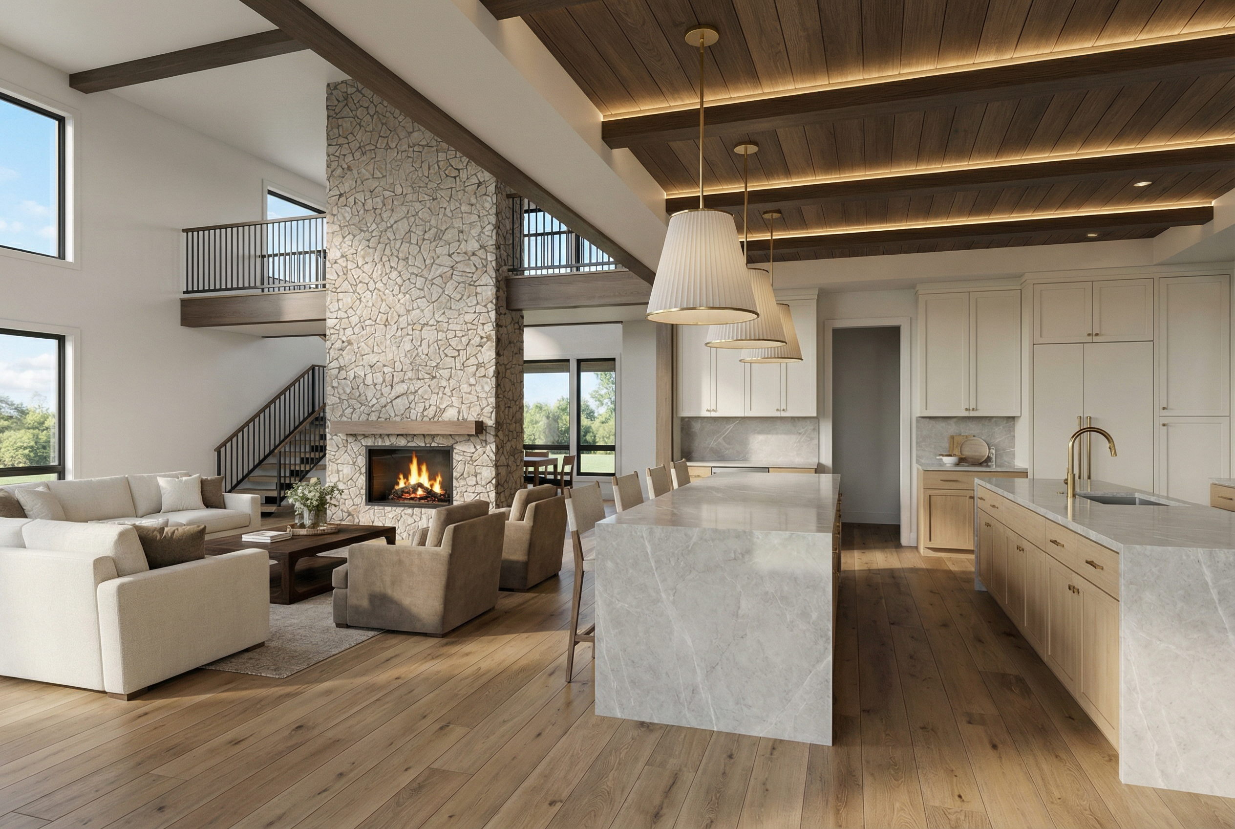 highest priority it s important to keep the sizes of everything the same change textures and materials but keep the sizes of everything the same its important to keep to scale the person in the photo is 5 6 for scale use her for scale and remove her from rendering do not change size of windows or doors do not add doors or windows do not change or add fixtures keep cabinets fridges ovens and all fixtures in the same place and the same size materials in kitchen warm modern luxury kitchen large waterfall island with light gray marble or quartzite subtle veining polished finish thick countertop profile full height slab waterfall edges light natural wood cabinetry for lower cabs mixed with painted off white cabinets for upper cabinets and full height cabinets flat panel doors minimal hardware integrated appliances soft warm lighting oversized pendant lights with pleated fabric shades over one of the islands not both and brushed brass accents tall brass faucet neutral color palette creamy whites warm taupes light wood tones wide plank oak flooring clean and minimal styling high end residential design soft ambient glow architectural visualization ultra realistic 8k detail the kitchen has two islands one with a sink and faucet and one doesnt keep the chairs at the back of both islands remember that its very important to keep the overal size and placement of the cabinets the same as the reference photo the ceiling in kitchen wood is darker than cabs there is led light strips between ceiling and trim pieces with light coming out living room materials neutral color palette creamy whites warm taupes light wood tones wide plank oak flooring clean and minimal styling high end residential design soft ambient glow architectural visualization ultra realistic 8k detail natural realistic stone on fireplace add hearth to fireplace keep the ceiling the same in all areas except the notes for the kitchen