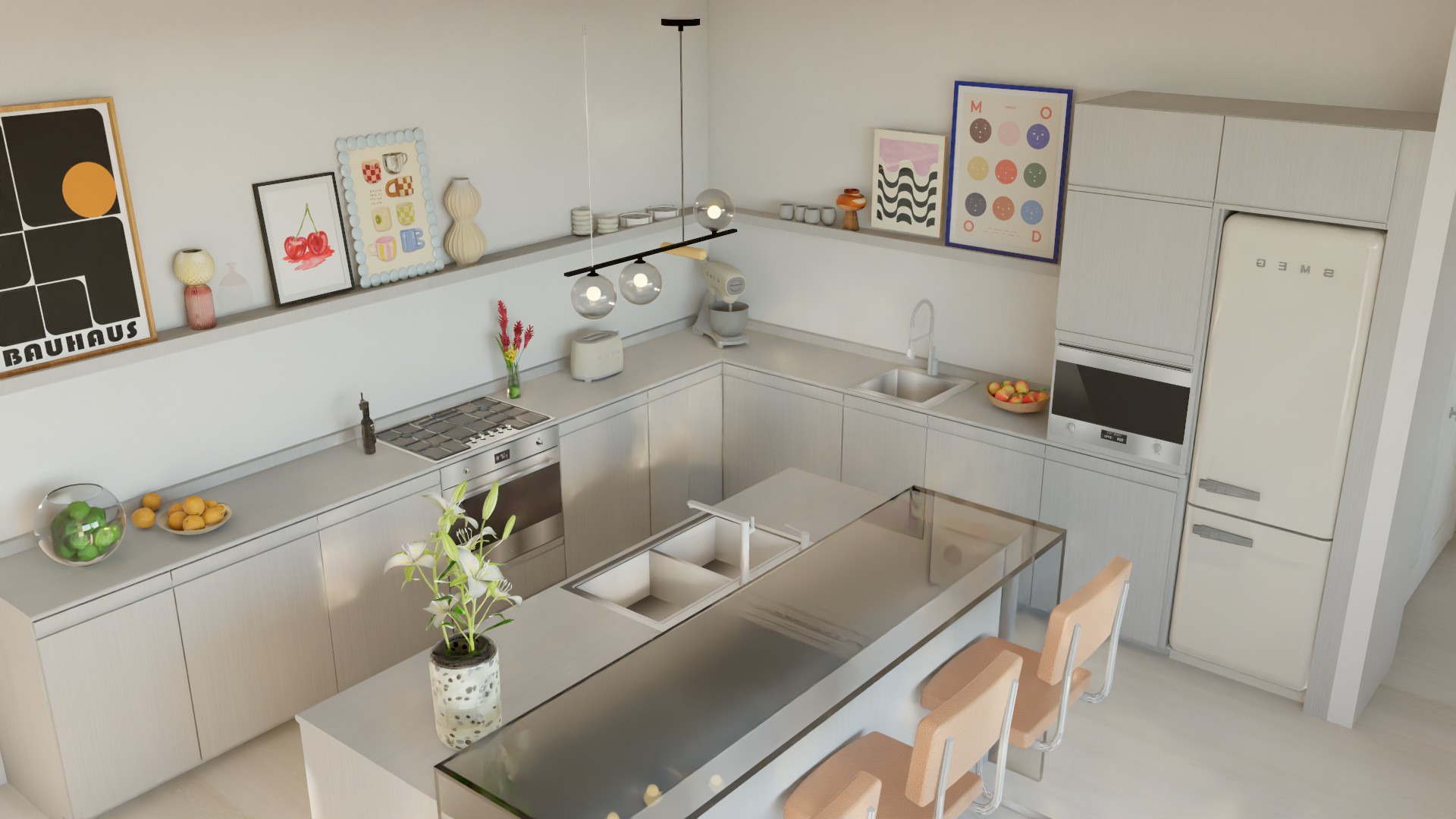 photorealistic kitchen interior based strictly on the provided image preserve all cabinetry stainless steel surfaces appliances island layout stools artwork shelf items colors proportions and camera angle exactly as shown do not redesign replace or stylize any element lighting realism primary focus soft natural daylight filling the space evenly warm accent light interacting naturally with the orange leather stools and pendant fixtures realistic light falloff and gentle shadow gradients no harsh contrast no bloom no overexposure stainless steel metal true brushed stainless steel appearance subtle directional grain soft reflections with slight distortion no mirror like gloss no plastic shine leather stools natural leather texture with soft creasing warm color absorption matte to satin finish not glossy cabinetry surfaces light wood with subtle grain variation smooth matte cabinetry finish clean but realistic edge softness camera exposure 35mm lens equivalent balanced white point natural interior photography exposure final result must look like a real professionally photographed residential kitchen calm warm and believable not cgi not stylized not cinematic stainless steel surfaces appear clean and polished with soft controlled reflections finish is shiny stainless steel chrome like reflections are slightly blurred with realistic light falloff and perspective distortion subtle directional grain remains visible in the metal highlights are crisp but restrained with no bloom no glow and no plastic sheen