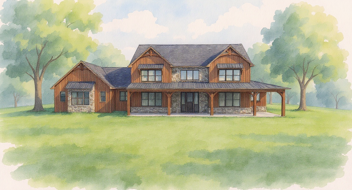 photo realistic of timber frame building with reclaimed white siding and black window trim and stone wainscot watercolor trees and urban environment in the background extensive watercolor landscaping surrounding the building