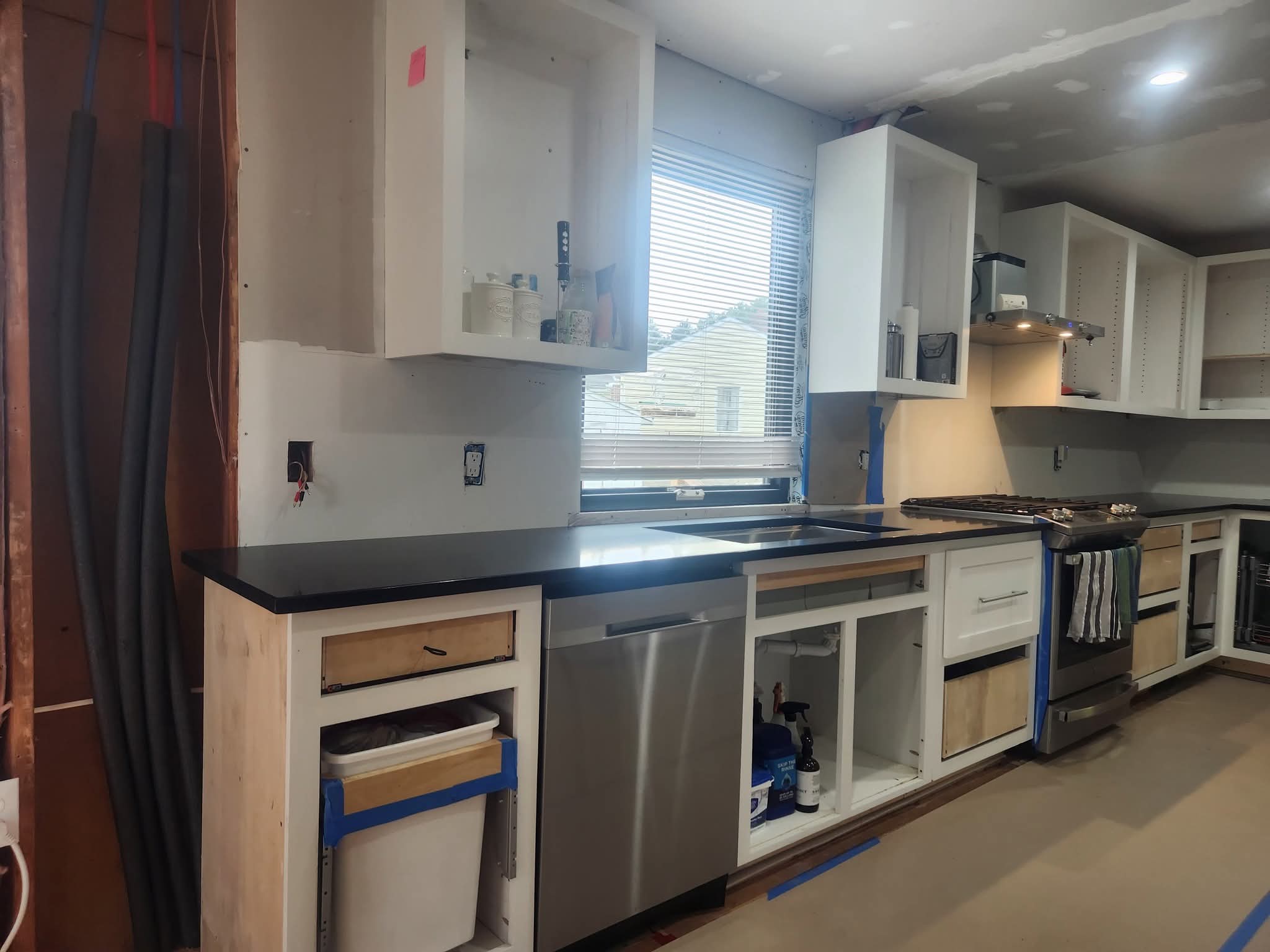add white cabinet doors to upper cabinets add doors to lower cabinets add fruit bowl and bread and flowers on counter add wood floor light color remove outlets on wall