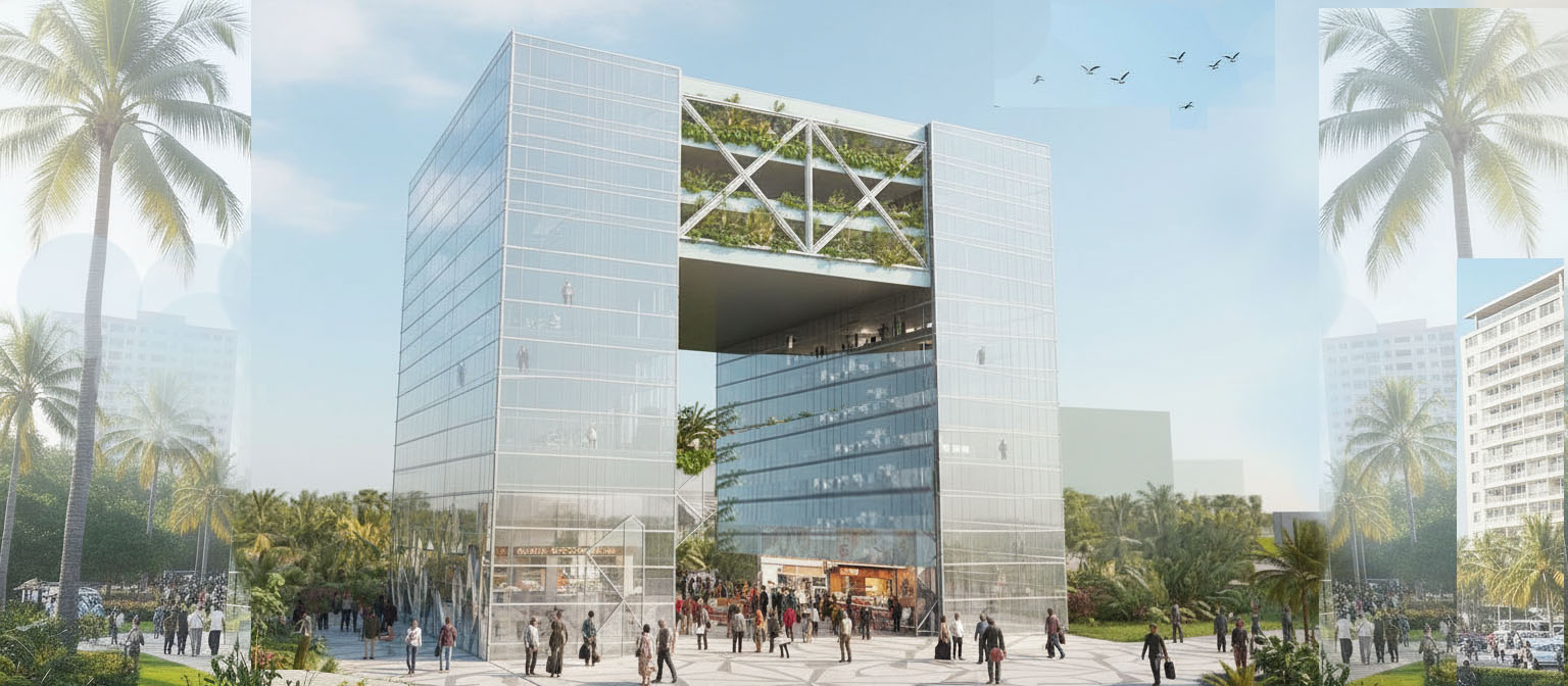 the glass is not reflective it is clearer more transparent and has a whiter tone through the windows some people can be seen the glass panels are rectangular and vertical the lobby curtain wall is similar to the rest of the building but features a different pattern activity inside is visible with many people and hints of gastronomic venues there are many people entering and exiting the building the building is slightly taller than in the original image there is also more activity underneath the structure with more people the plaza floor is not a smooth surface it is a light colored pavement with different patterns in the grassy area there are additional plant species overall the image should look more ethereal and lighter the residential building on the right and left are slightly shorter behind the building a boulevard can be seen with cars bicycles and many people walking and enjoying the space