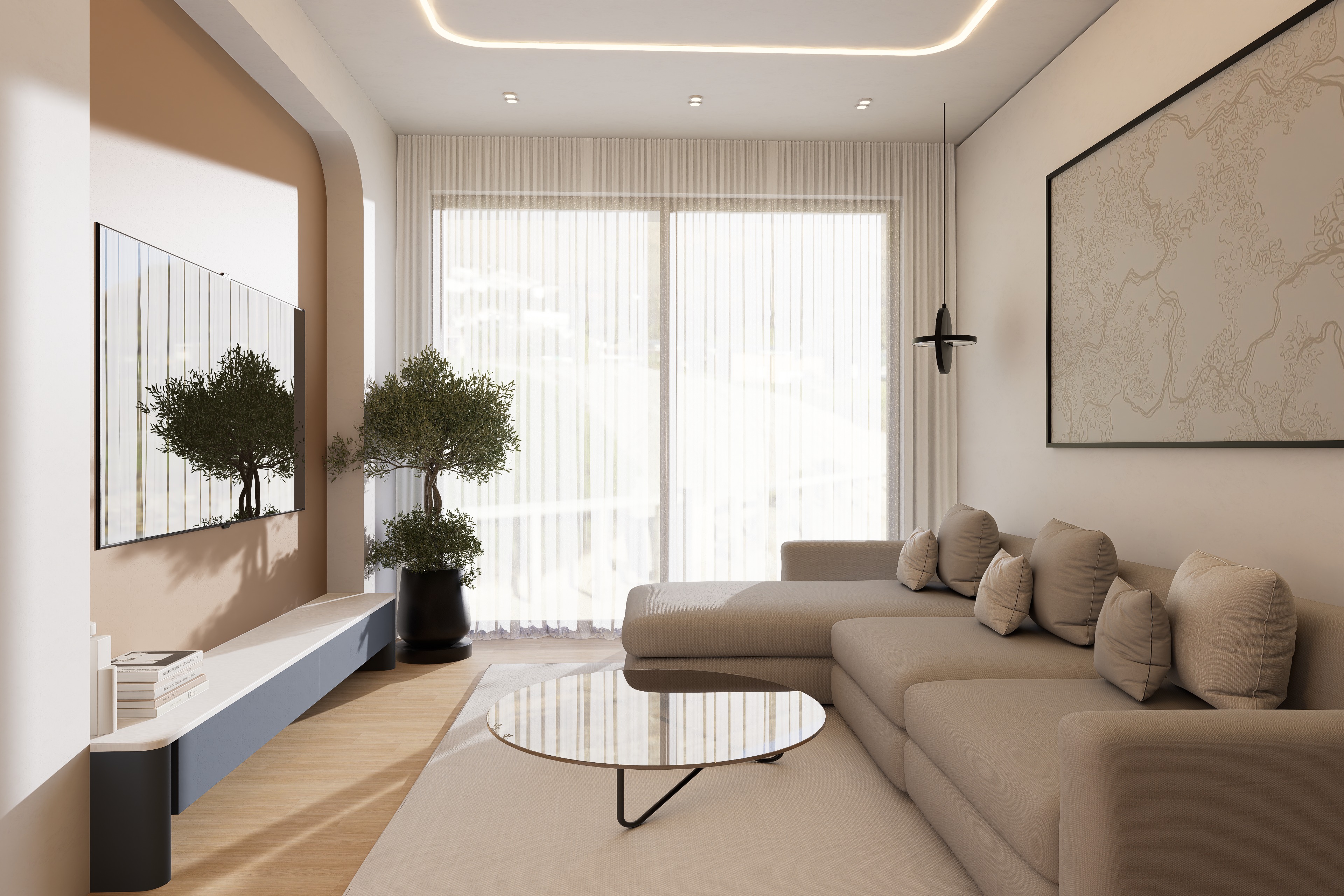 ultra realistic render of a modern warm minimalist living room keep the exact same camera angle composition geometry furniture placement and proportions from the input image no redesign no shifting scene right side large l shaped beige fabric sofa with soft cushions center round glass coffee table with thin dark metal legs left wall tv mounted inside rounded niche with warm beige back panel and floating console white top blue grey base background full height sheer curtains with daylight behind left corner olive tree in matte black planter right wall large framed abstract artwork ceiling recessed cove led lighting spotlights materials walls warm off white matte plaster niche soft warm beige terracotta tone matte sofa textured beige fabric visible weave soft folds floor light natural oak wood matte rug soft neutral woven texture coffee table clear reflective glass with subtle tint console matte blue grey lacquer light solid surface top curtains sheer white fabric with realistic translucency lighting strong natural daylight coming from window behind curtains center back light should diffuse through curtains soft realistic glow clear soft shadows on floor sofa and console subtle ceiling led cove light warm 3000k not overpowering balanced exposure no blown highlights on window realism photorealistic architectural photography style accurate reflections on glass table and tv real fabric behavior creases compression on cushions micro shadows and depth everywhere no flat shading no cgi look high detail 4k sharp output strict rules do not change colors do not move sofa table or tv do not modify niche shape or ceiling do not add remove objects do not change camera or perspective only enhance realism materials and lighting