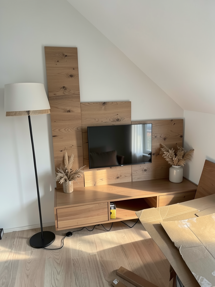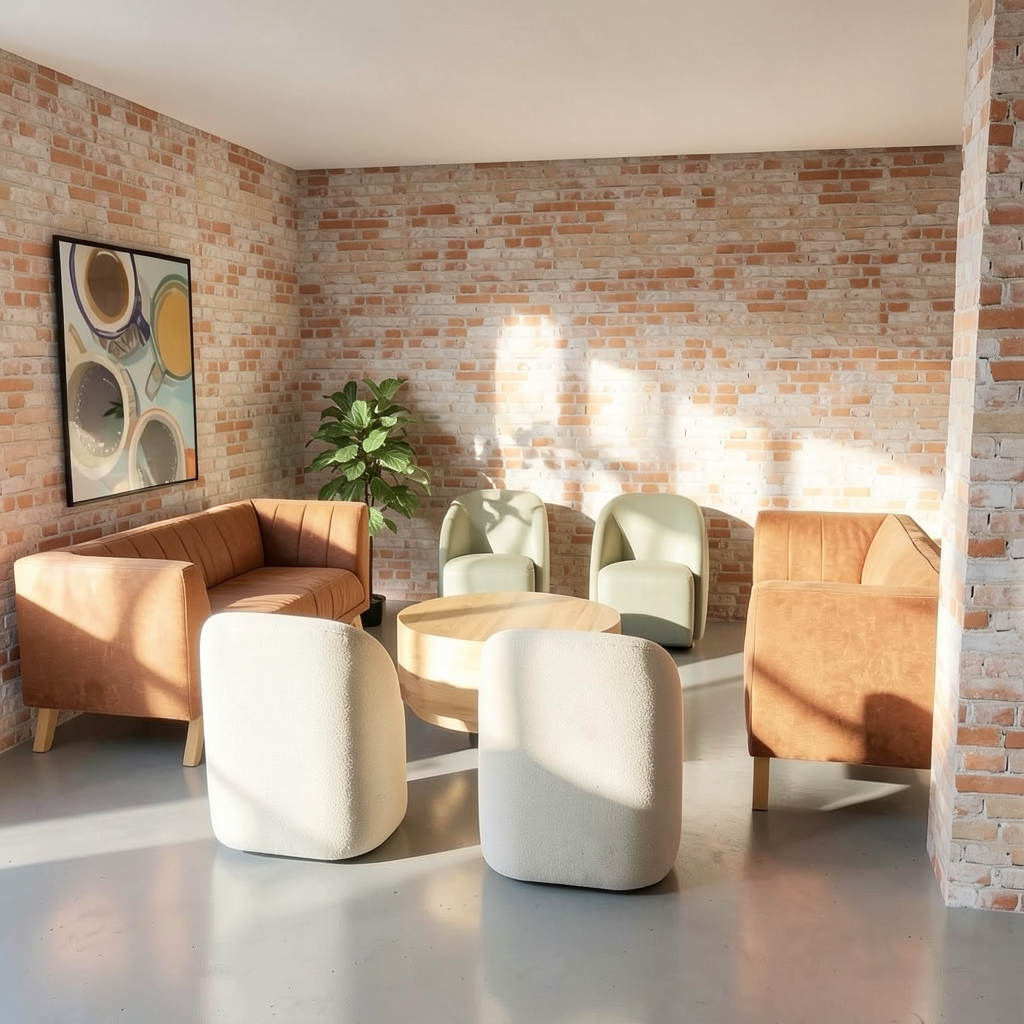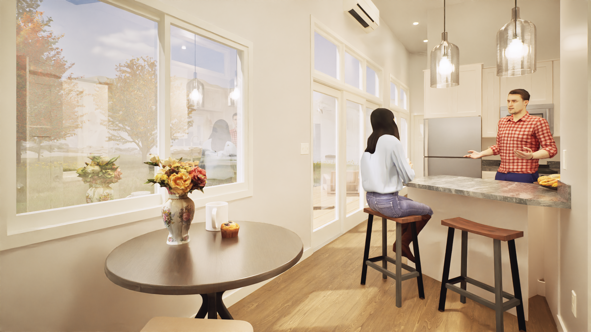 photorealistic interior architectural photography warm natural daylight under cabinet lighting and illuminated can lights in the ceiling soft directional light with realistic shadow falloff and gentle contrast bright but warm atmosphere realistic global illumination with subtle ambient occlusion in corners and at material transitions dslr with a 35mm lens eye level perspective professional architectural composition and framing and realistic depth slight depth of field foreground and midground in focus background softly flailing off physically based materials throughout with enhanced texture detail natural surface variation and subtle imperfections with realistic sheen high quality windows with realistic thickness subtle reflections of the interior soft exterior reflections and accurate light transmission windows feel transparent exterior visible through windows feels real and grounded with natural daylight realistic trees and landscape interacting with the light warm color temperature balanced with natural daylight soft highlights realistic shadows gentle contrast subtle camera noise natural exposure not overly sharp soften corners and edges professional photography style