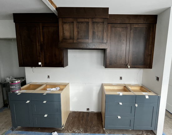 do not change the cabinets in any way preserve the exact cabinet colors materials finishes dimensions door and drawer styles hardware spacing alignment and all geometry exactly as shown do not alter the countertop shape backsplash appliances flooring lighting fixtures or wall structure only remove the construction materials clutter and mess from the scene clean the room and make it look finished and staged add a few simple tasteful home accessories appropriate for the style of the space but do not add or remove any furniture windows or architectural elements maintain the original lighting direction and realism enhance clarity and polish the photo while keeping the cabinetry and room design completely unchanged do not alter the lighting to keep the cabinet colors as they are in the image add flooring countertops and backsplash add a slide in range below the hood add black cabinet pulls to the door and drawer fronts stage for a kitchen remove the beam on the ceiling