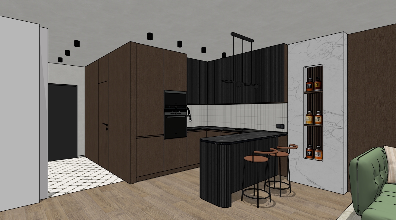 render with natural day light maintain colours add light to the lamps and add the bookshelfs instead of bottles and marble panel