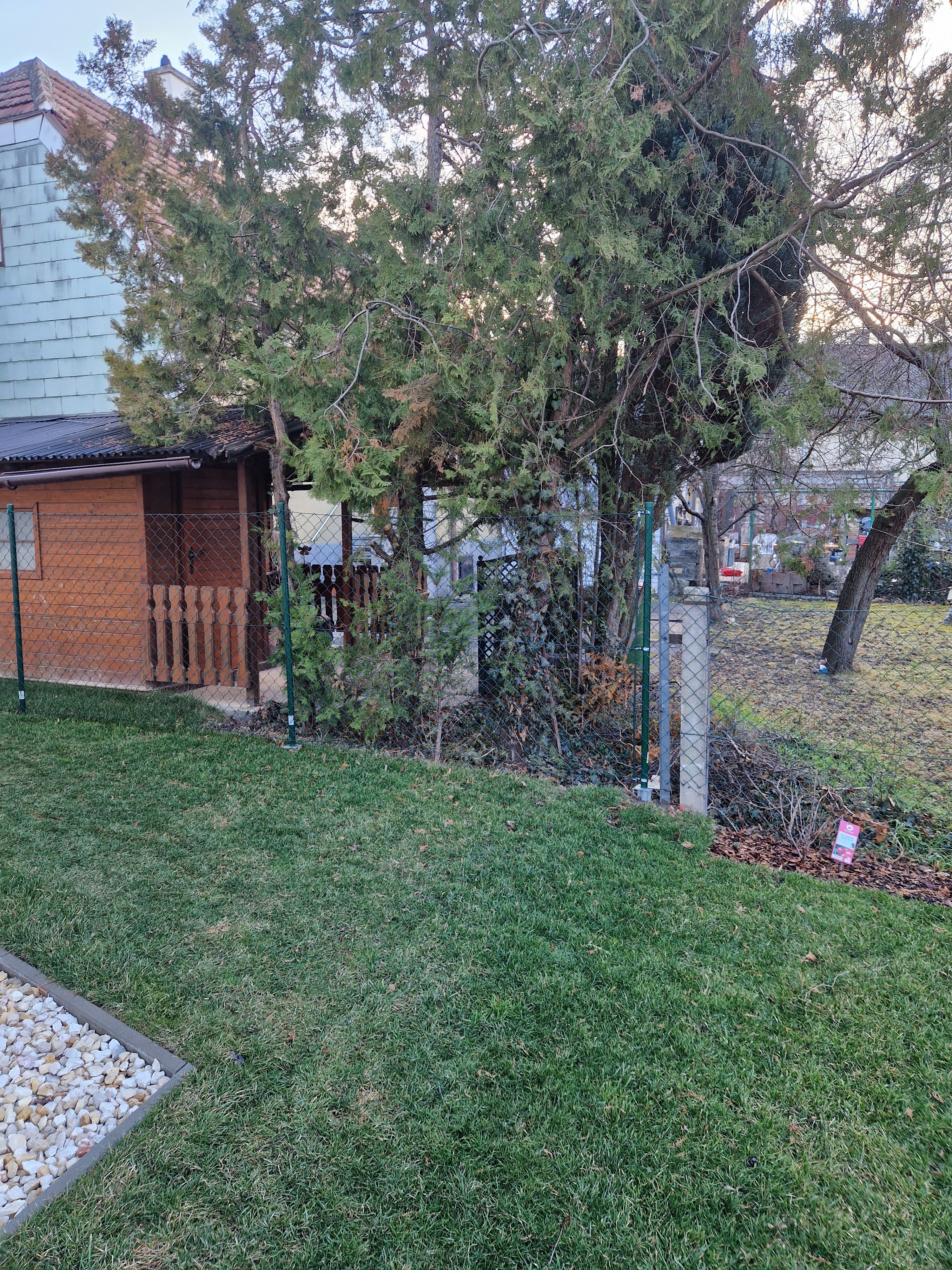 create a large wooden vegetable garden bed along the fence in vertical pyramid form ca 4m long and 1m