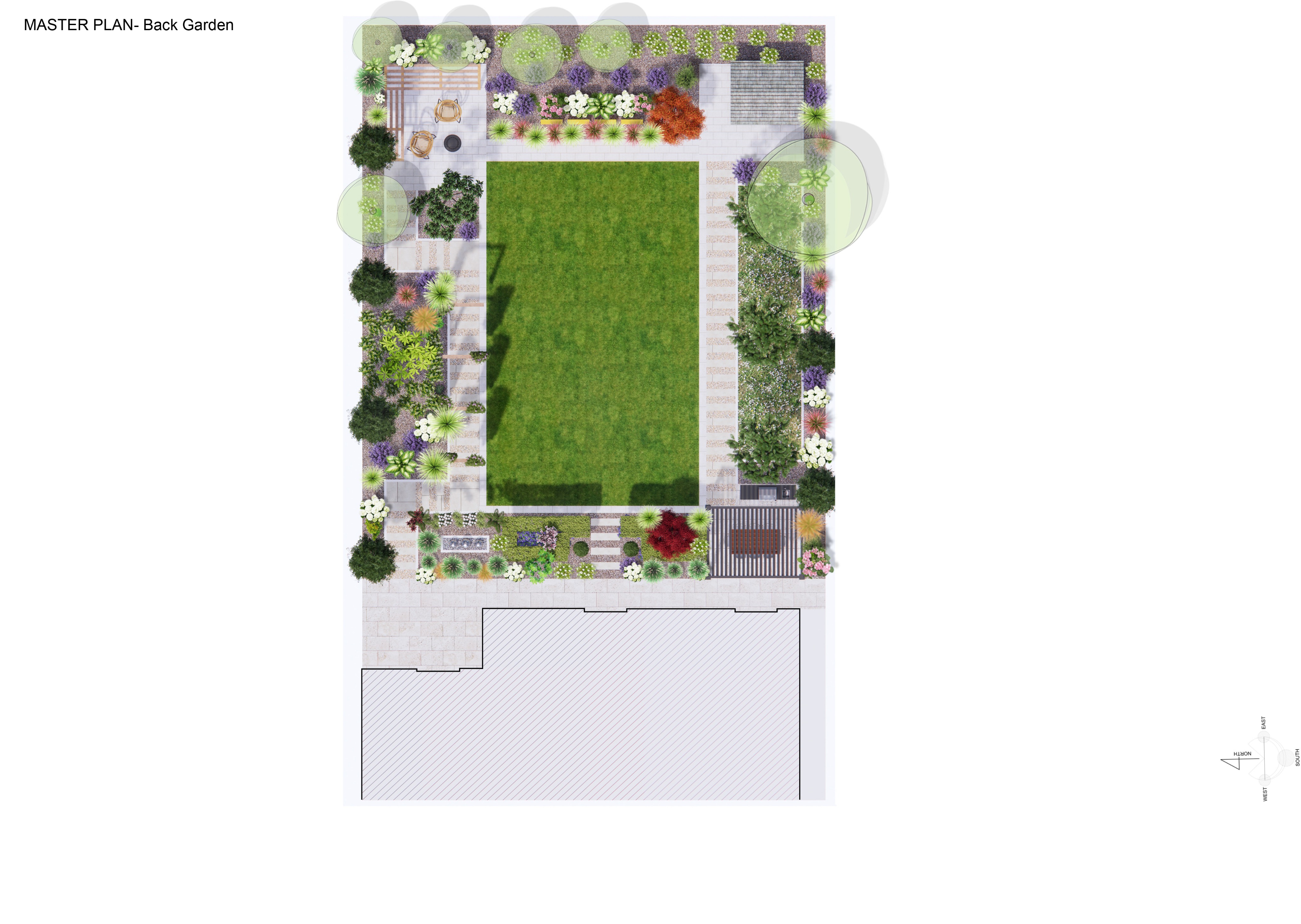 modern back garden design 19000 x 24000mm size with natural stone limestone paving metal shed 3000 x 2400mm size architecture