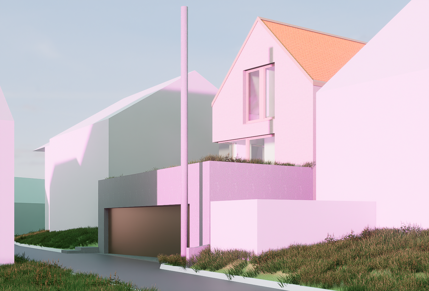 create a photorealistic architectural visualization of the provided scene from an elevated aerial viewpoint preserve all original materials colors lighting fog and the overall atmosphere of the scene exactly as they are enhance the composition by adding realistic trees in the foreground naturally integrated into the scene without altering the original design intent maintain high material accuracy realistic light behavior in fog soft shadows and a professional architectural visualization style do not change the mood weather conditions or environmental atmosphere of the scene