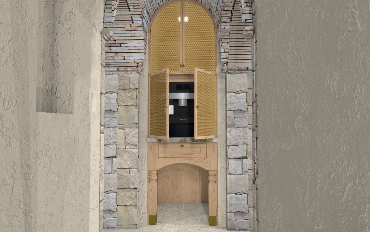 create a more realistic cabinet in the hall maintain same textures colors and fixtures