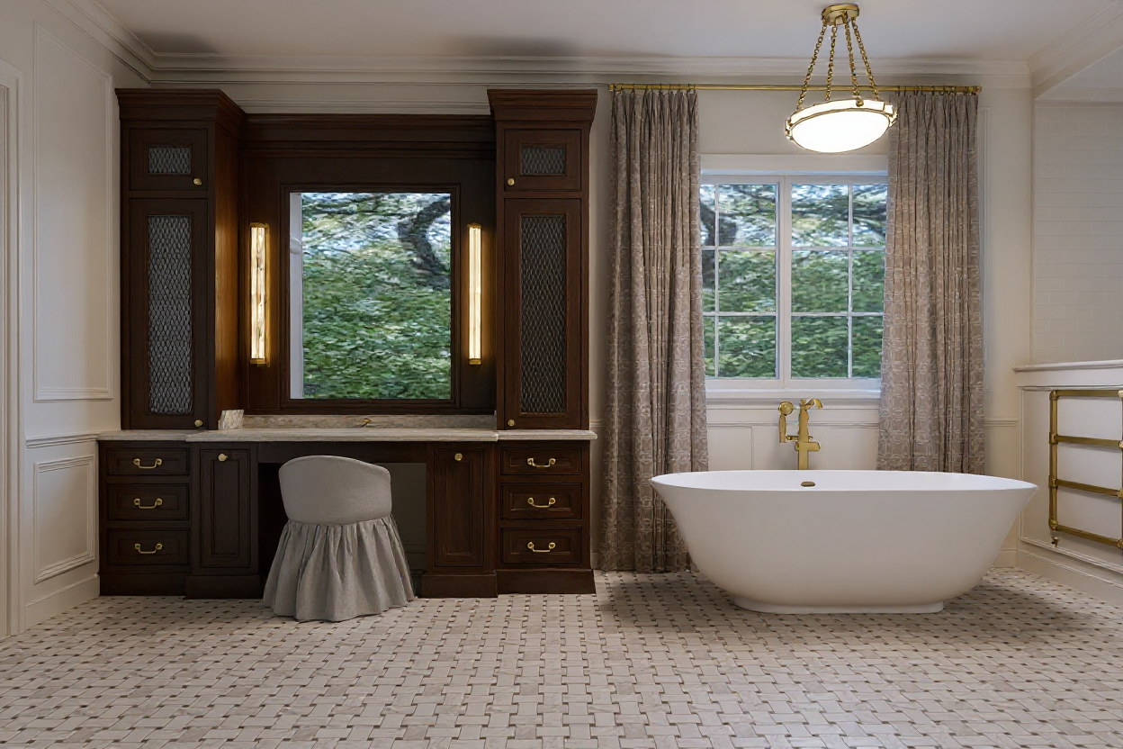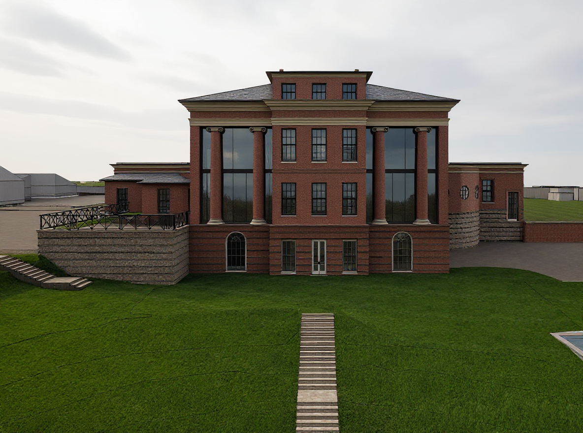 keep the original stone wall with flint and glazing behind columns reflective in one piece render a majestic classical building with a grand entrance featuring large elegant columns painted in soft rose pink the walls are a harmonious blend of deep brick red creating a classic and sophisticated look windows have detailed black frames enhancing their structure the roof is a slate gray adding a touch of timeless elegance surrounding the building is a beautifully manicured lawn in vibrant green pathways are in light stone gray complementing the lush greenery illuminate the scene with warm golden sunlight casting soft shadows for a serene and inviting atmosphere