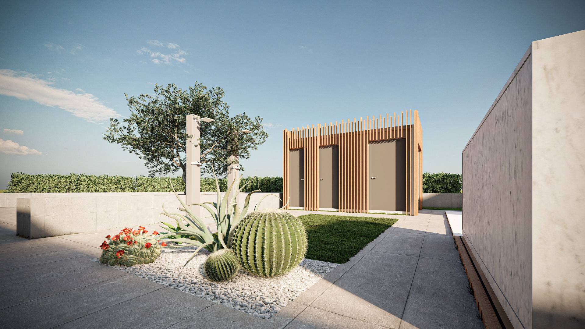 do not change the view only enhance the current materials and make the landscape nicer vegetation detailed textures in the wood siding and glass reflections and a vibrant clear sky with light atmospheric depth render in hyper realistic architectural visualization quality 8k resolution add real people and a bit of mediterranean greenery but don t overdo it the render should look realistic