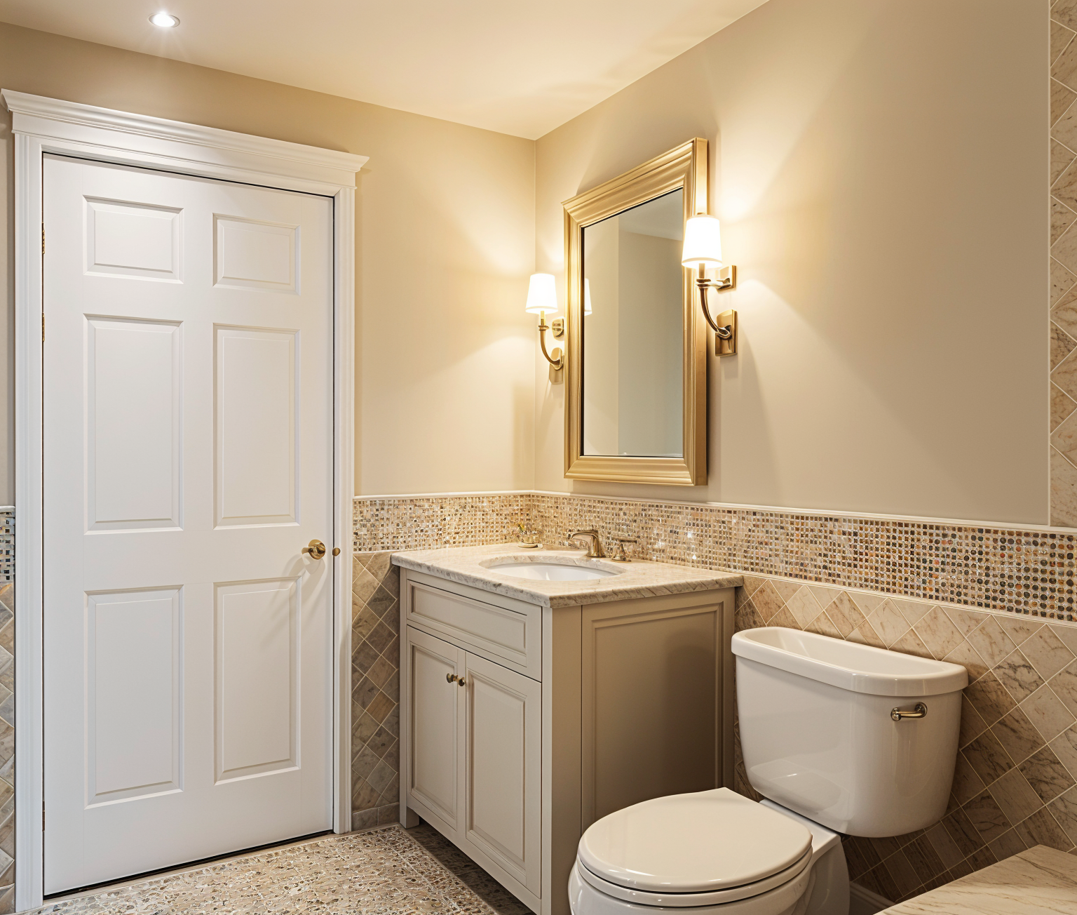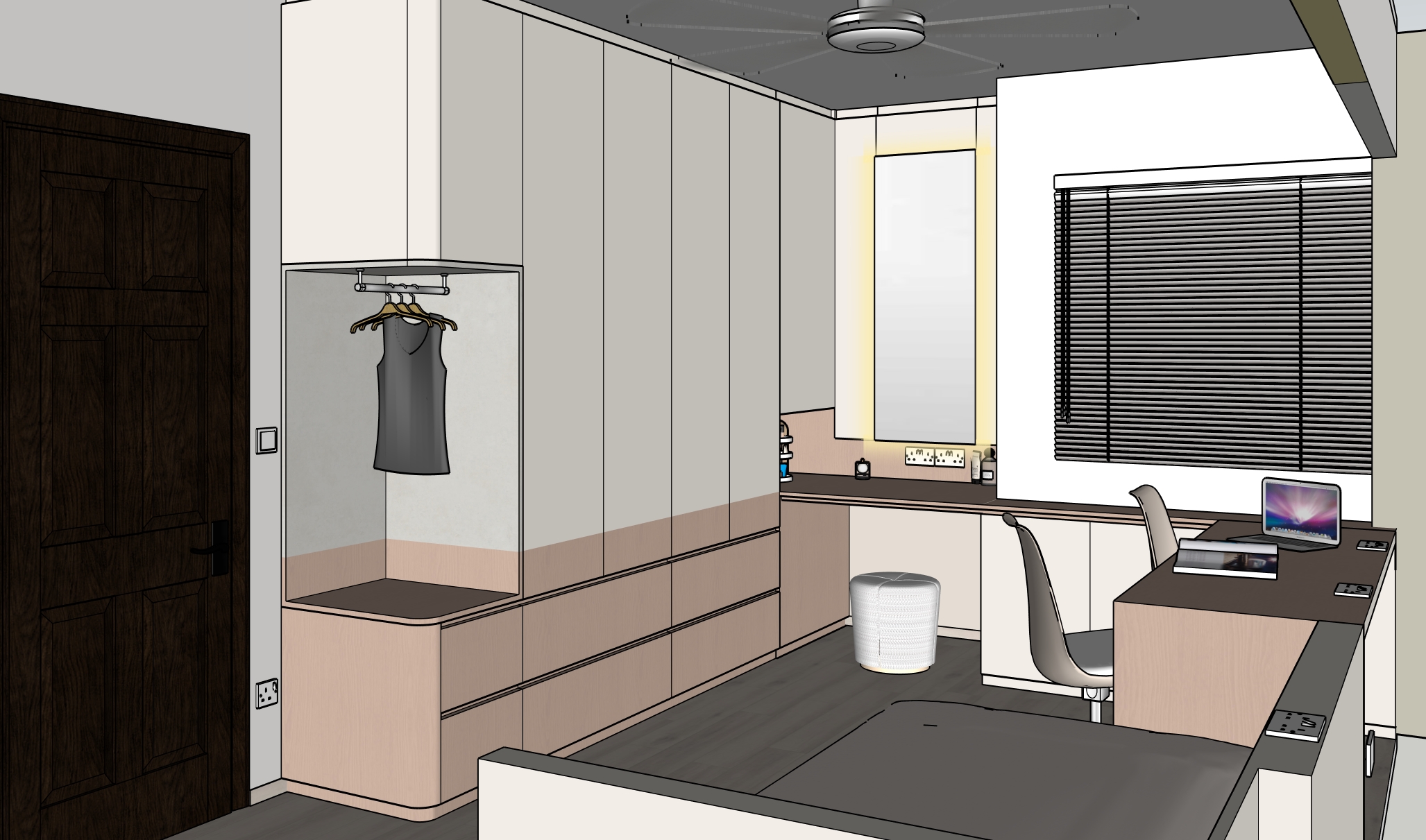 colours to remain accurate as per original given picture wood texture to be subtle dresser top hung middle in mirror drawers and table surface in muted soft pink subtle wood grains niche in light beige microcement and muted soft pink subtle wood grains top half of carpentry in light beige 2 casement door below window in light beige ceilng in off white floor in muted light beige vinyl subtle grains 50mm recessed top skirting on top of mirror cabinet