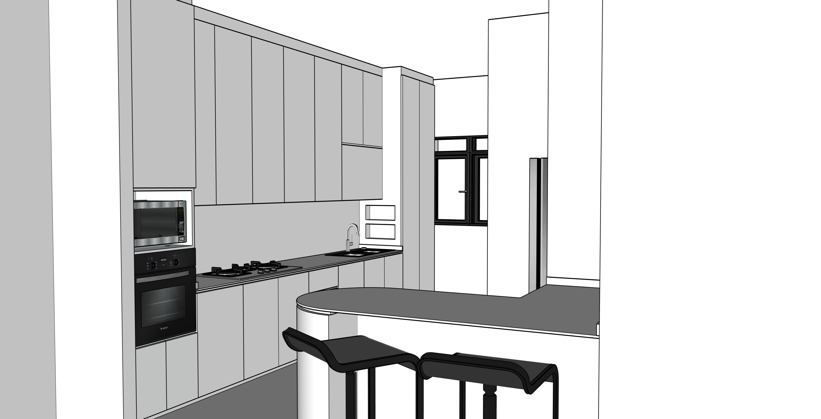 kitchen counter top and backsplash in matt white marble with grey veins same material for the island counter top bottom of the island is in the same color as the bottom kitchen cabinets add in warm led lightings under the top cabinets add in black magnetic track lights with warm lighting add in black pendant light above the kitchen island top cabinets in matt beige color while the tall unit on the left is in light wood color add in 600mm x 600mm matt marble tiles on the floor keep all the walls and ceiling white add in some display plant in the 2 niche beside the sink add in some display cutlery set on the island top on the left edge of the picture add in height height bronze mirror reflecting some parts of the living room add in a pot on the stove with a kitchen knife set and salt and pepper shakers beside it add in some cutlery set with glasses on the kitchen island