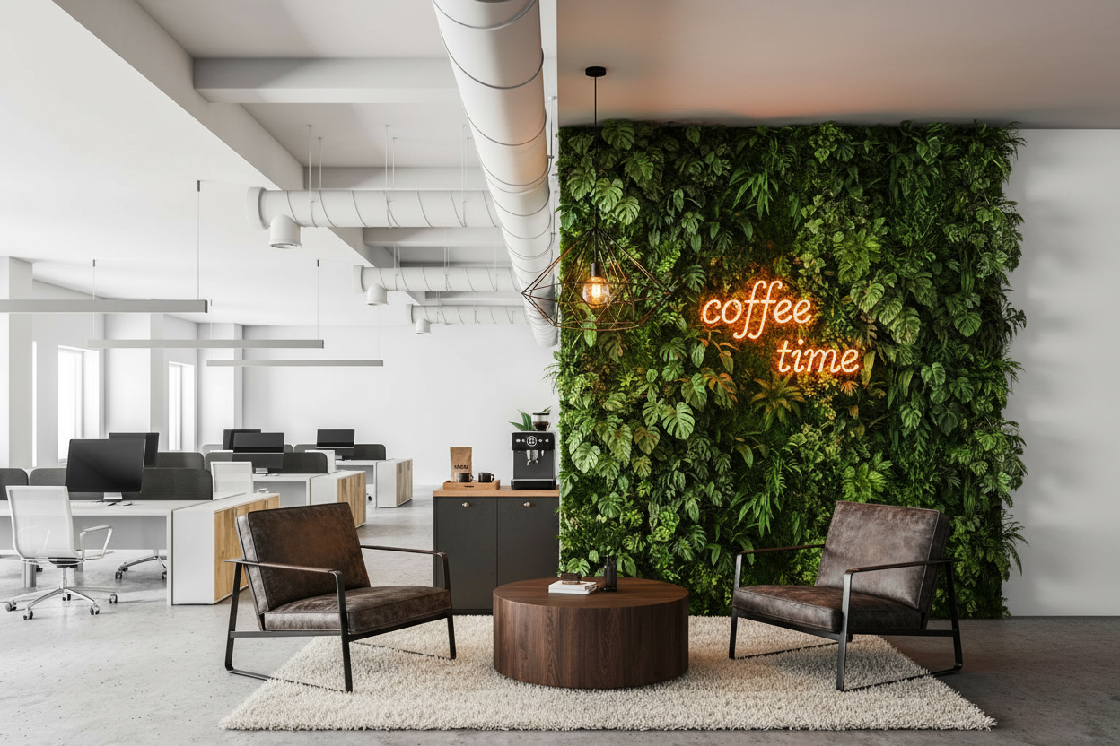 a small and cozy social zone in a scandinavian style office interior a seating area with two sculptural chair in warm wood a low warm wood coffee table a round rug art on the wall green plants art sign on wall that says time for coffee a small coffee machine station integrated nearby calm scandinavian color palette with warm neutrals dark wood and soft textures