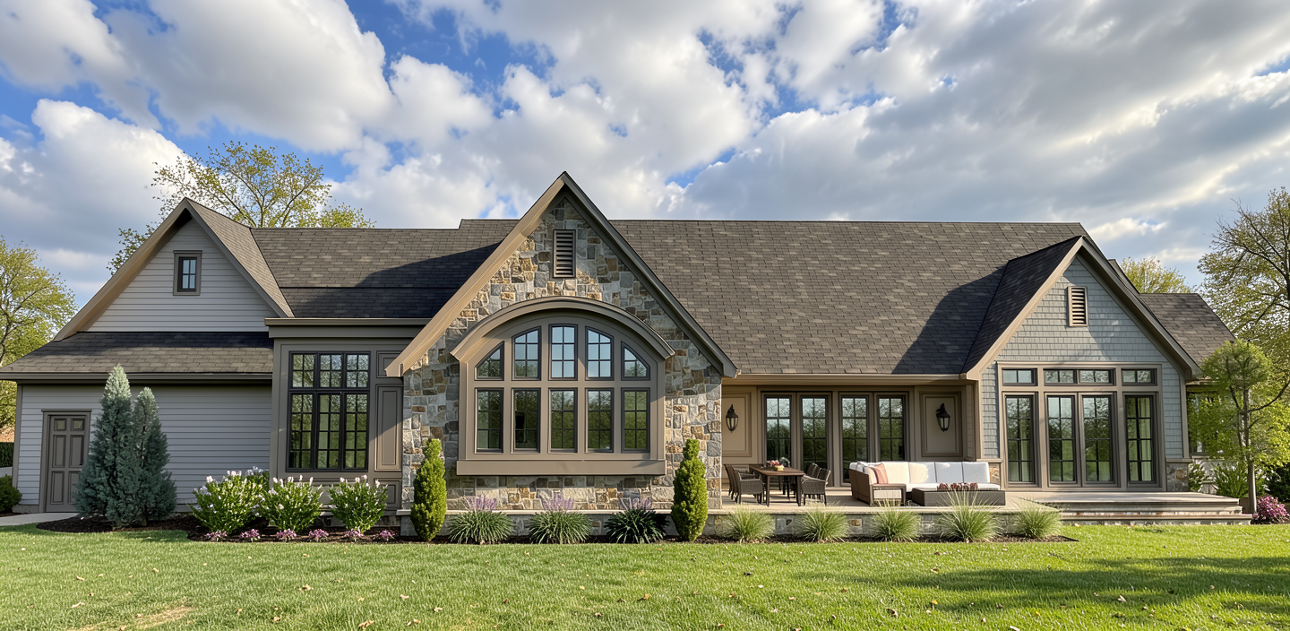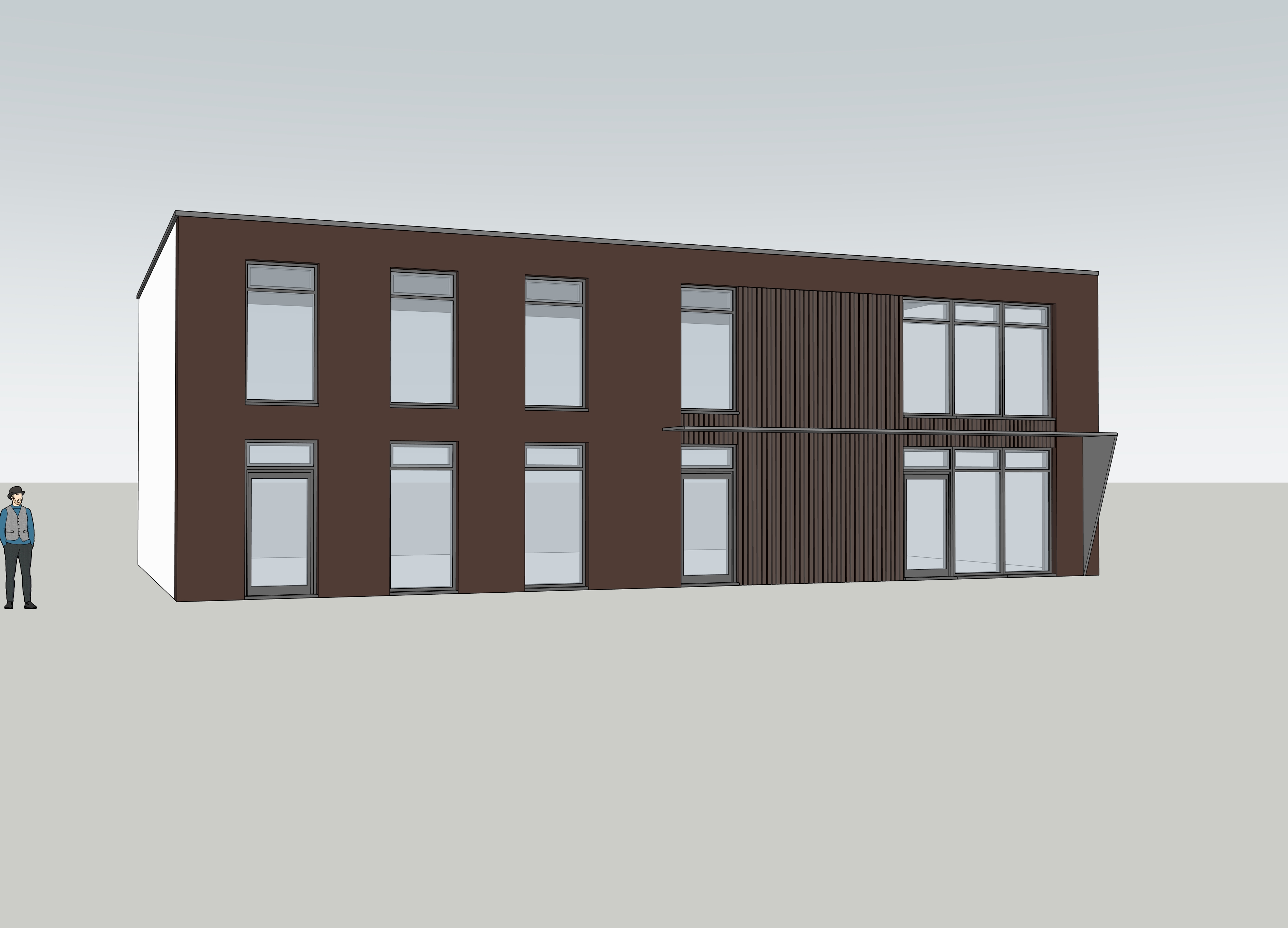this building has a carpark in front of it show nice asphalt with yellow parking markings in front and 1 or two cars in neutral colors that don t distract from elevation by their position or color the weather is good with clear sky and not too strong sunshine in the windows of the building you can see slight reflection of opposite side of the road with brick buildings of the same scale with shop units on the ground floor and some larger trees the elevation is finished in terracotta brown mid texture render with crisp detail and neat capping to the top of the building windows have dark anthracite frame there is a slightly recessed part of elevation to the right where the main entrance with canopy over is placed the canopy is a sleek lightweight steel with linear hidden lighting to its inner edge the recess is finished in composite ribbed cladding in tones to match render overall the building is contemporary and sleek in a detail there are lights inside the building showing welcoming reception with reception desk and comfortable hospitality style seating the facility is a high end care for elderly so you can see customers over 65 with their minders nursing staff in uniforms and a person on the wheelchair the building has inviting feel colors look natural and pleasant to touch the metal work is consistent simple and elegant